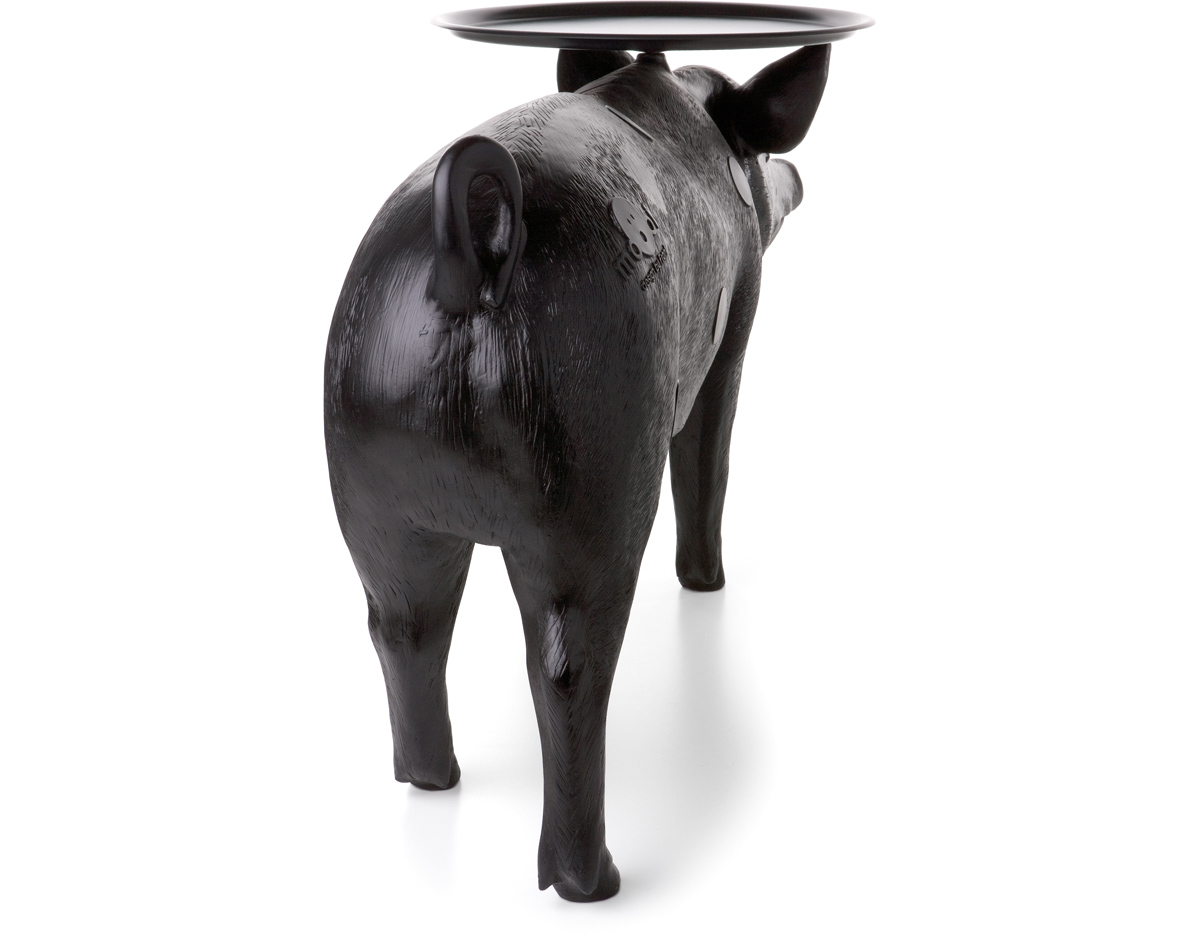 你想不想用一直原物大小的小猪台给你的客人提供饮品?猪台是Front设计的三套动物家具系列中的一个,他们设计的其他两款动物系列分别是马灯和兔子灯。Front设计团队成立于2003年,由四个设计师组成。所有成员都参与设计过程中从最初的讨论和想法阶段到最终产品生产。他们的作品建立在共同的讨论、探索和调查相关的不同主题的基础上。最终的产品常常通过在产品领域及材料组成间向参观者传达了一个关于他们设计经历的故事。猪台的托盘并不以对称的形式附着在猪上。托盘设置的角度可以调整的,且如果地面不平整还可以进行调整。猪台有着猪标志性、可爱的笑脸,颜色只有黑色可选。