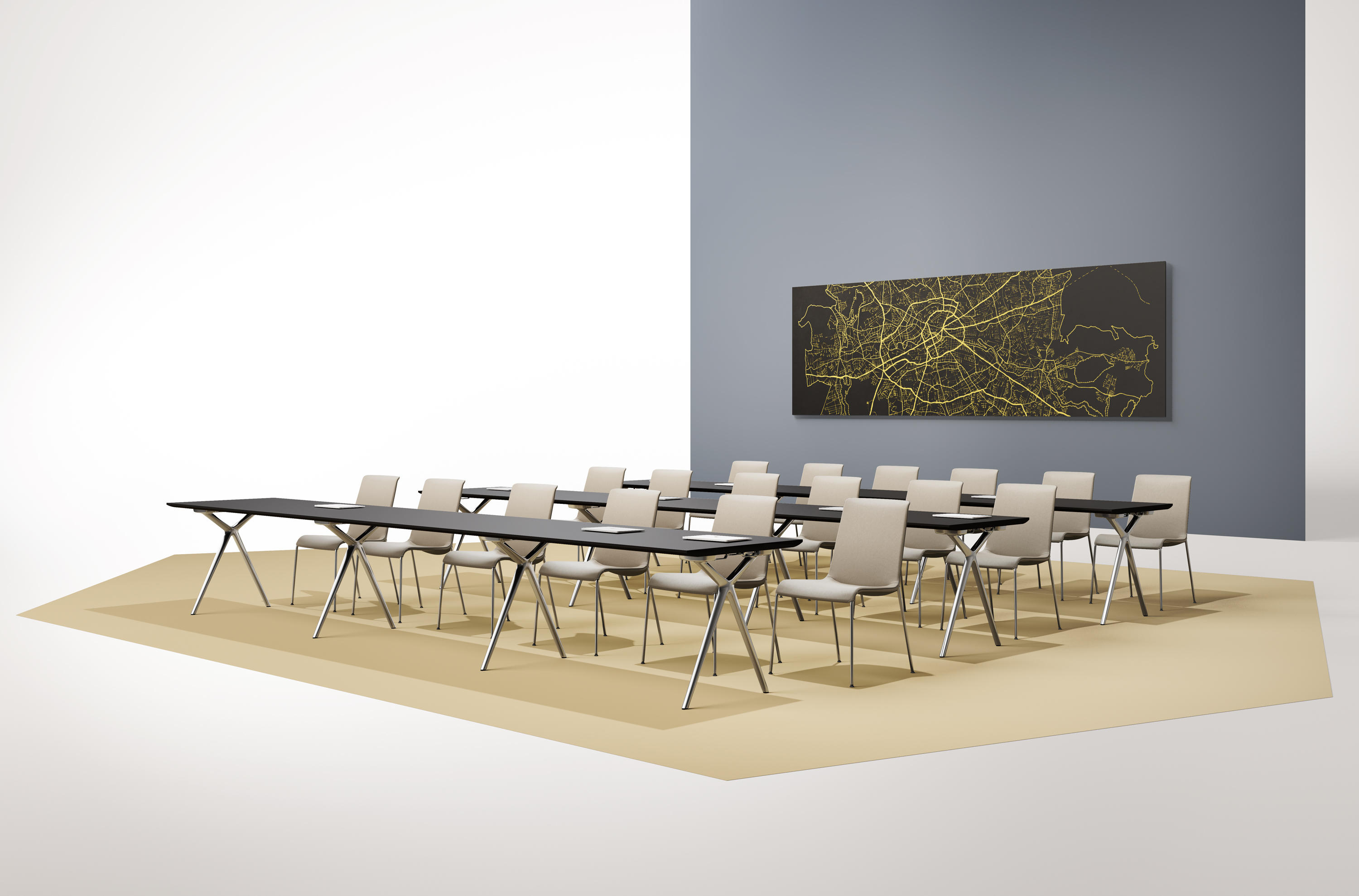 这款Conference-X最大的亮点就是:桌子腿是可以将两个桌面一起快速而轻松地结合在一起,而不需要借助任何工具。而这个专利技术的的连接关键是:桌子腿顶部处在固定锁,桌底有锁扣,以此保证绝对安全和稳定。这也很好的解决了会议台的多样性:从个人的工作桌到成排的会议桌,桌子形状、大小、都可以通过脚架来进行拼接.