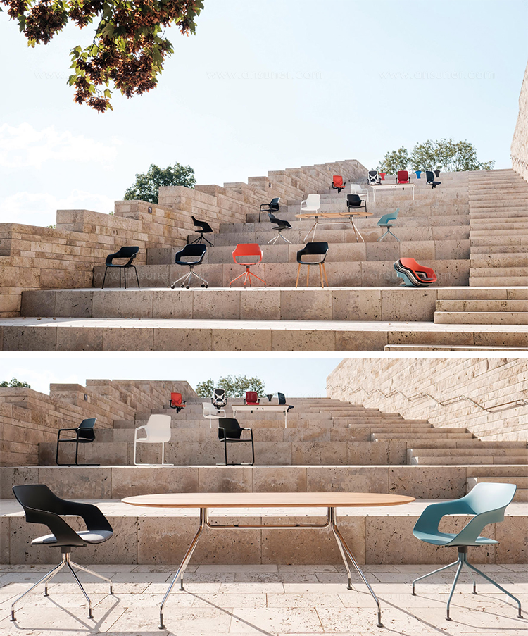 对于Wilkhahn来说,设计师马库斯Jehs和jurgen Laub已经设计出了一张椅子和桌子,这是一个完美的组合。它叫做Occo。Occo结合了巨大的通用性和大量的设计选项,设计语言清晰且可立即识别。背部和两侧的凹处的特殊形状允许椅子堆叠(当一个镀铬的、四腿的金属框架被选中时),同时也提供了高超的坐舒适性。座椅本身是非常坚硬的,但由于它的形状和不同的材料的不同,它的背部非常灵活。