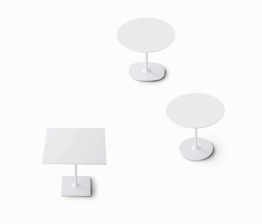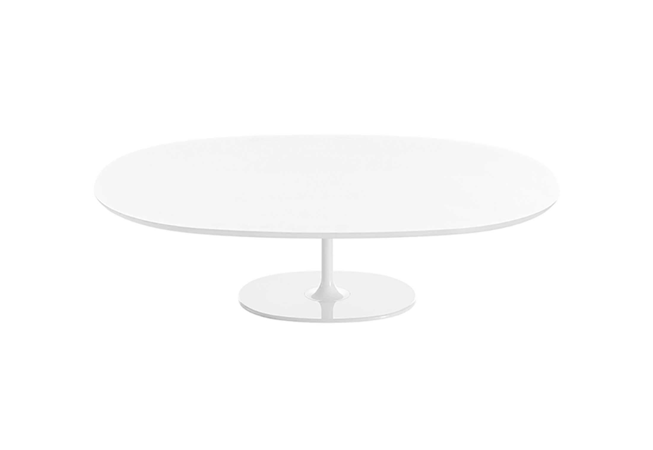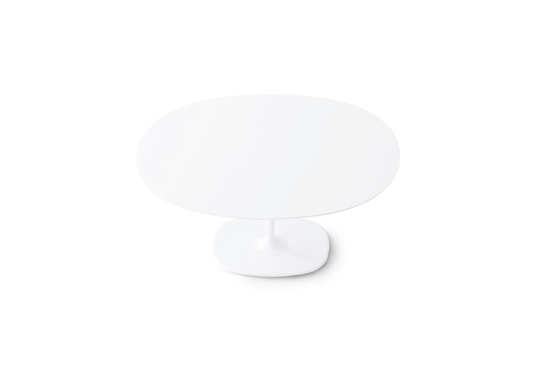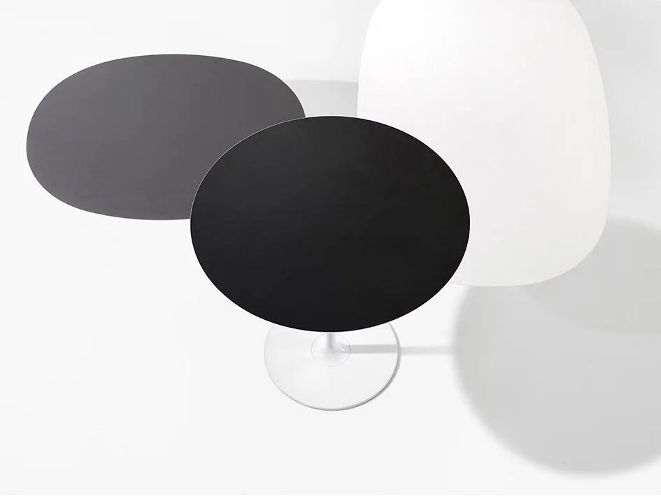 咖啡桌为椭圆形底座,白色有光泽或黑色哑光粉末涂层钢,顶部为白色压花MDF(厚2.5厘米)或层压板FenixⓇ(厚2,6厘米),有不同尺寸可供选择。 身高35厘米。