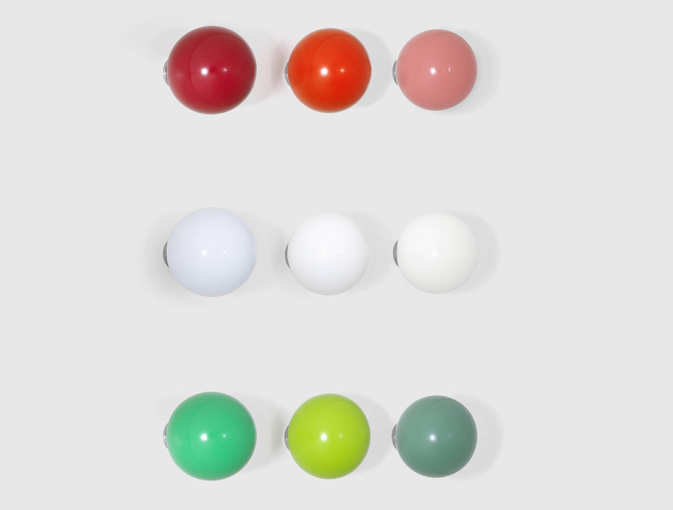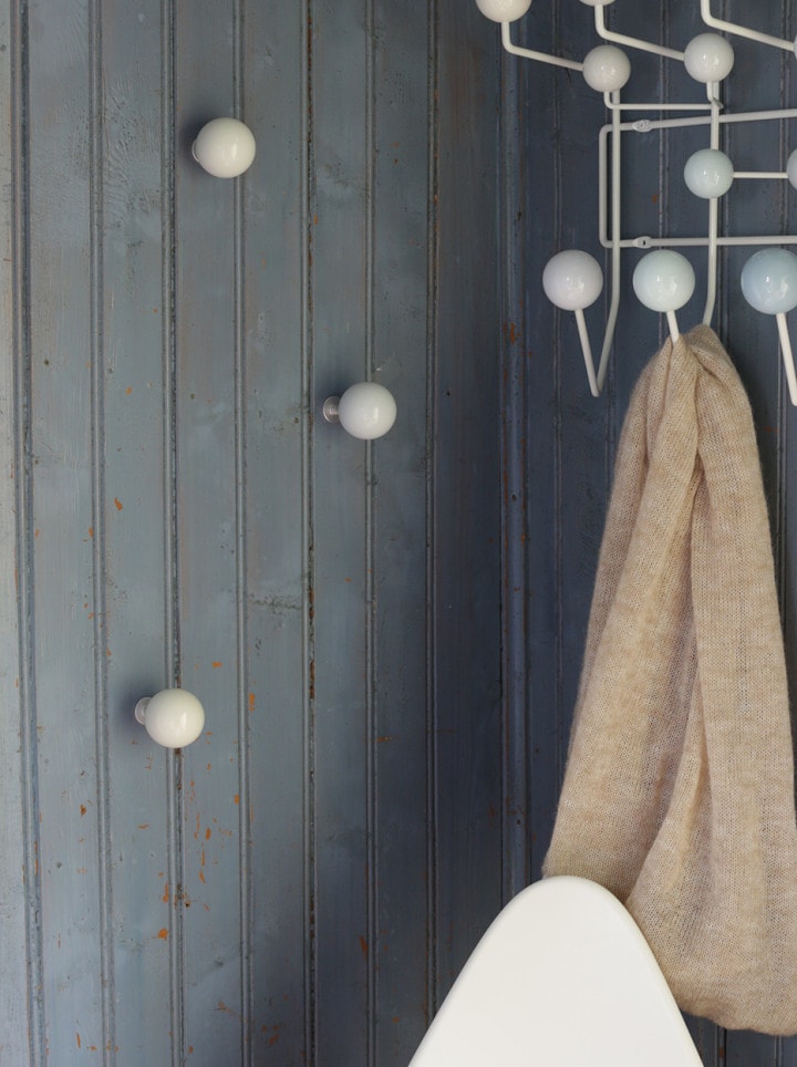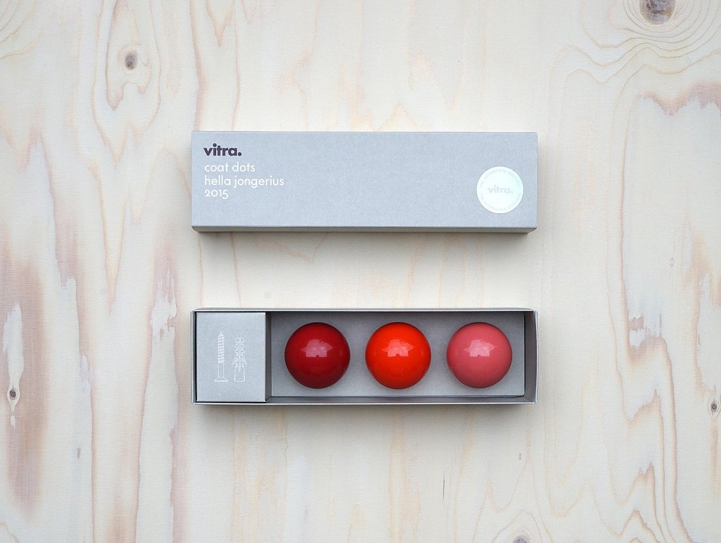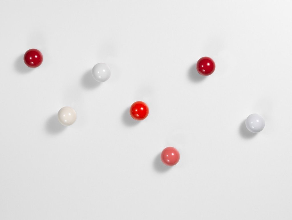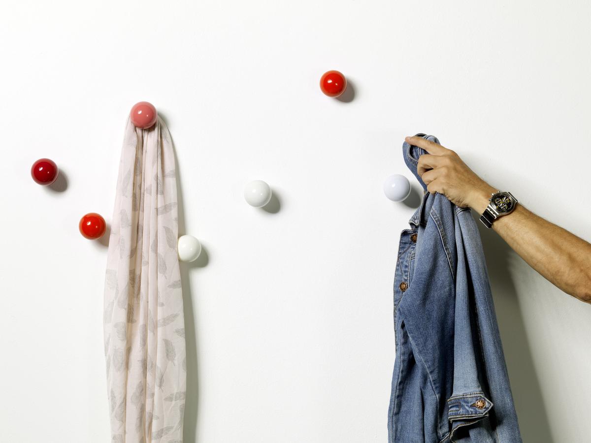 Hella Jongerius的Coat Dots安装在一个可伸缩的销钉上,可以稍微拉离墙壁,为夹克和衣架提供方便的挂钩。 同时,它们也可以简单地用作装饰墙元件。 涂层点有三种颜色协调的球,包括安装材料。