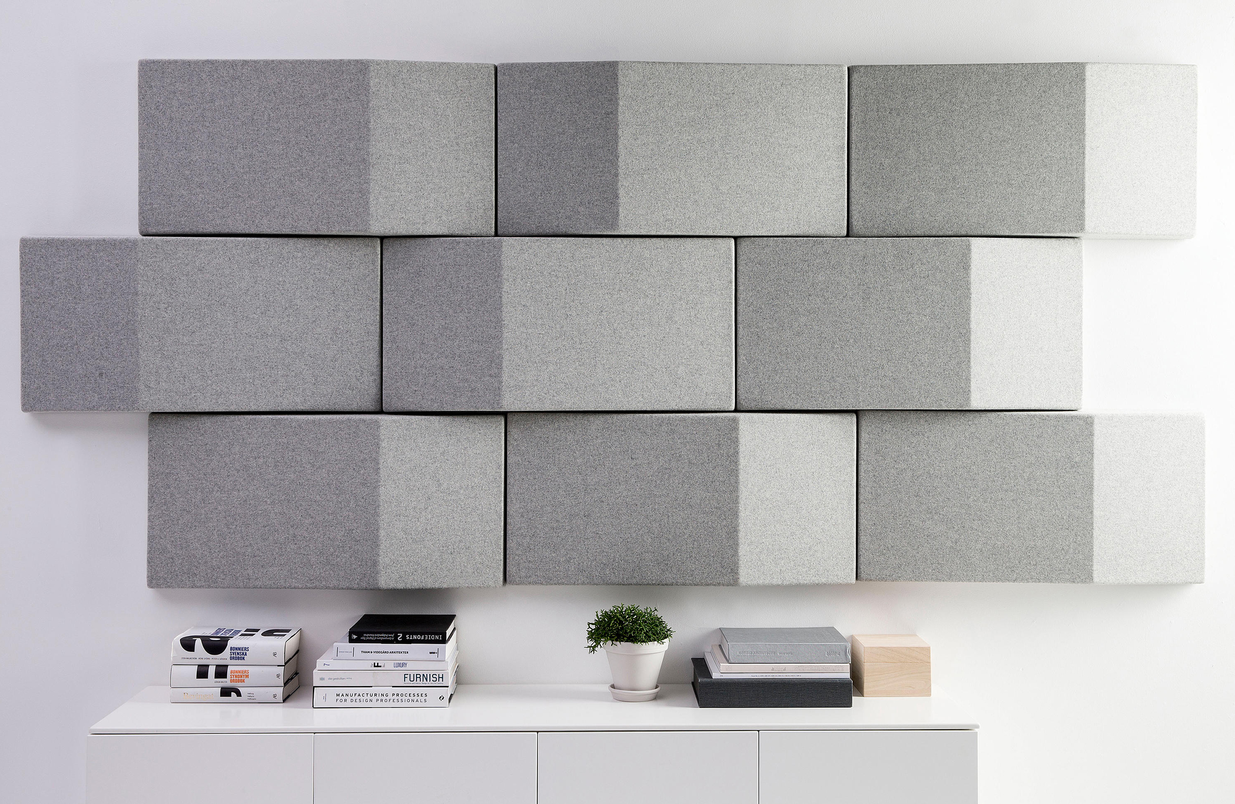 Triline Wall吸收并散发令人不快的声音反射,从而改善声学效果。由于模块具有直边,因此它们非常适合创建图案以覆盖大面积的墙面空间。每个模块包括安装在MDF板框架上的吸音再循环填充物。可见侧面采用羊毛织物装饰。该产品具有特有的三角形形状,可以打破击中模块的声波。由于采用隐藏式钢支架,产品可水平或垂直安装。