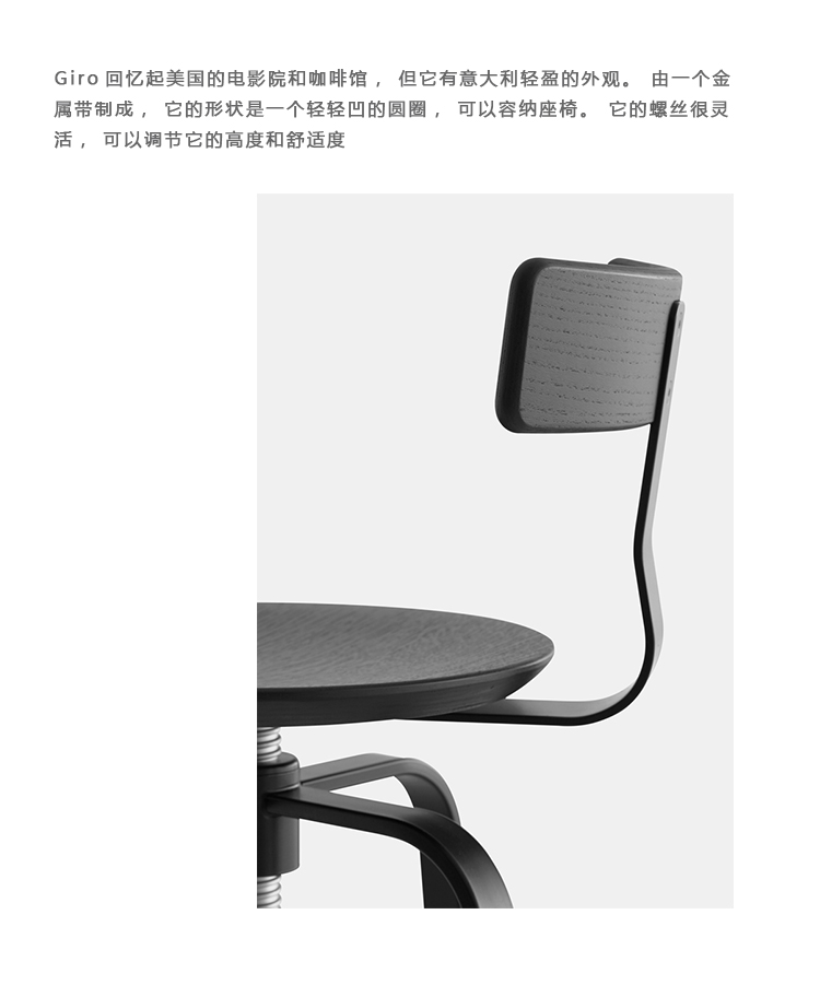 Giro回忆起美国的电影院和咖啡馆,但它有意大利轻盈的外观。由一个金属带制成,它的形状是一个轻轻凹的圆圈,可以容纳座椅。它的螺丝很灵活,可以调节它的高度和舒适度