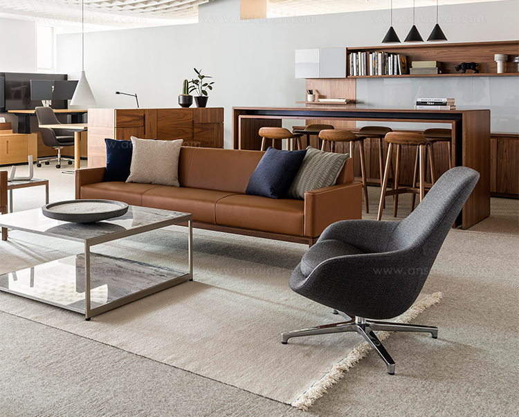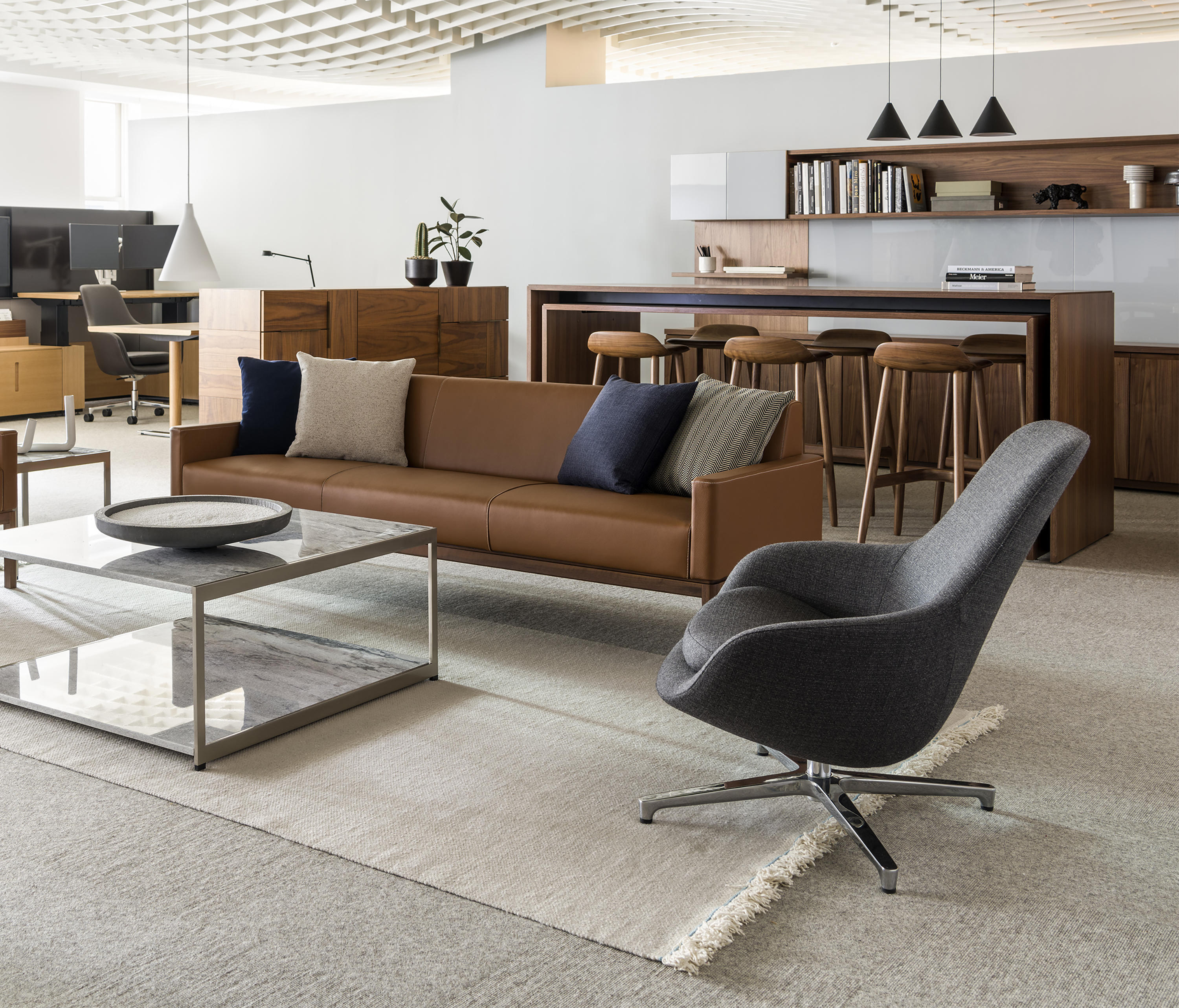 精致、流线型的高靠背Saiba休闲椅——以考究的织物材料精心裁剪,搭配纯黑色或抛光铝的底座——尤其在搭配矮款的带衬垫Saiba脚凳时,让人不由自主想要躺靠其中,享受一段悠闲自得的时光。