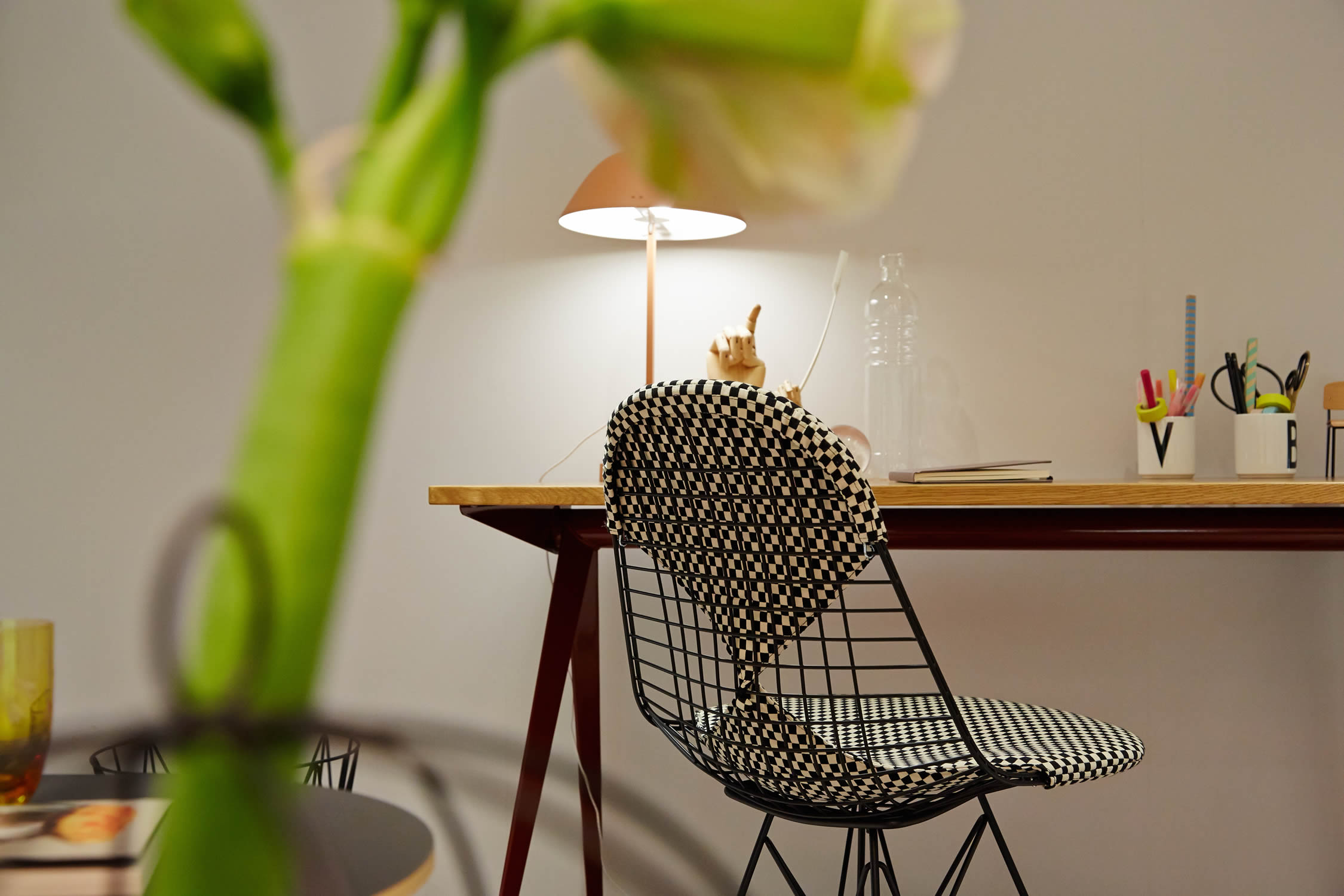 Charles & Ray Eames 1951 年發表的 Wire Chair 系列,以一片式有機網狀椅座,延伸變化出一系列不同椅腳及座墊搭配的單椅,這系列椅款輕巧透明的設計,在 60 年代可說是運用了當時最先進的技術來製作,靈感則是來自於鏤空的金屬收納籃,金屬條交織的椅座,彎曲的弧面不僅符合人體工學,在視覺上更具有穿透性。