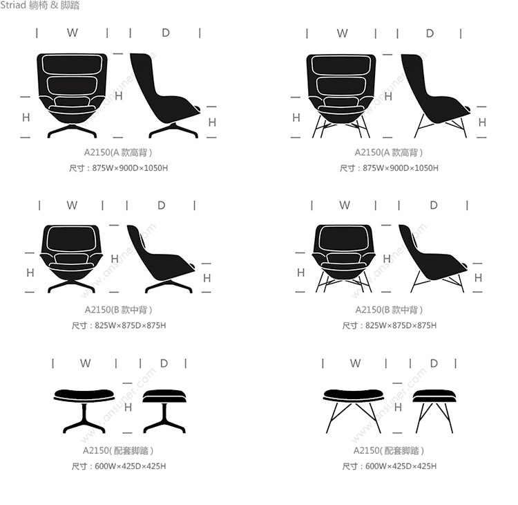 Striad能提供低、中、高三种靠背的款式,其中每款都可以选择四星自动返回底座或者固定的四腿钢丝底座,同时还能提供诸多饰面和软垫选项,适合与多种风格的空间搭配使用。