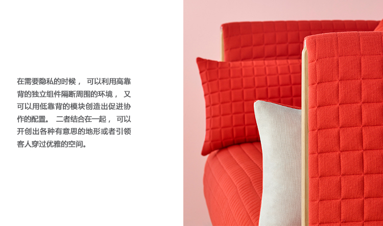 不论是工作还是在家,我们都需要一些共同空间,让我们可以进行适当交流,又能在不需要交流的时候在彼此周围独立的工作。ColourForm模块具有不同的靠背高度,能够创造出风格各异的办公环境。在需要隐私的时候,可以利用高靠背的独立组件隔断周围的环境,又可以用低靠背的模块创造出促进协作的配置。二者结合在一起,可以开创出各种有意思的地形或者引领客人穿过优雅的空间。
