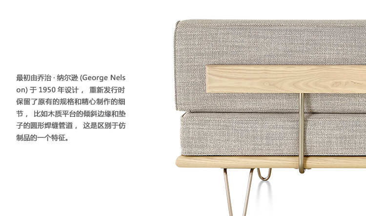 最初由乔治?纳尔逊(George Nelson)于1950年设计,重新发行时保留了原有的规格和精心制作的细节,比如木质平台的倾斜边缘和垫子的圆形焊缝管道,这是区别于仿制品的一个特征。不锈钢发夹腿或锥形木腿给它的经典纳尔逊触摸。缓冲增强了双密度泡沫,以更多的支持和耐久性,同时保持其轻质美学。随着住宅和公寓的面积不断缩小,纳尔逊牌(Nelson)躺椅等多功能家具为任何房间增添了一种实用而精致的感觉。