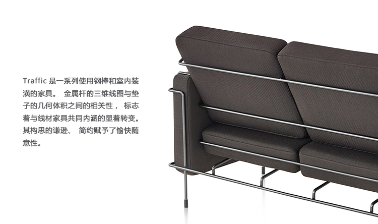 由Konstantin Grcic为Magis设计,休闲家具的交通系列提供了对比的研究:硬和软,线性和体积,俏皮和复杂。 钢制杆架具有平行和交叉线,为每个部件带来能量。 靠垫块,整齐地用布料或皮革装饰,传达出舒适和平静的感觉。