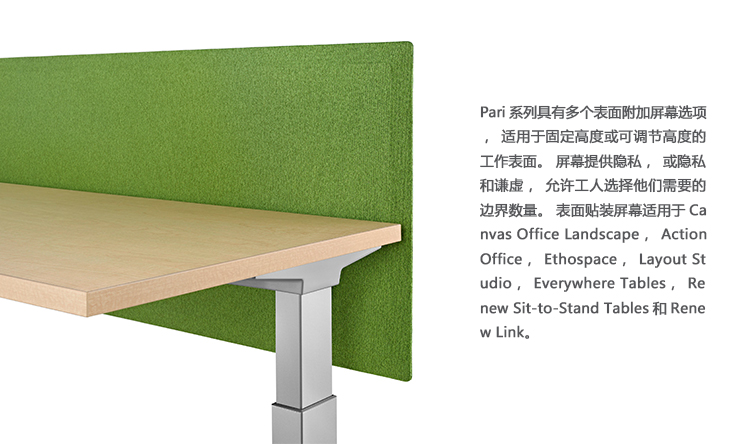 Pari是一个屏幕系列。 有些版本是独立式的,有些版本是贴在表面或框架上的,所有版本都是可粘的,并且共享无框架,薄的外形。 它们一致的细节和互补的颜色有助于美学的连续性,因为它们描绘了空间并提供了隐私。 Pari Screens与许多Herman Miller产品兼容,可在办公室环境中进行设置。 使用Pari Screens,组织可以压缩工作站并在较低的墙壁高度进行标准化,而不会牺牲员工所需的隐私,以便他们可以集中注意力,或创建个人空间的边界让他们感到舒适。