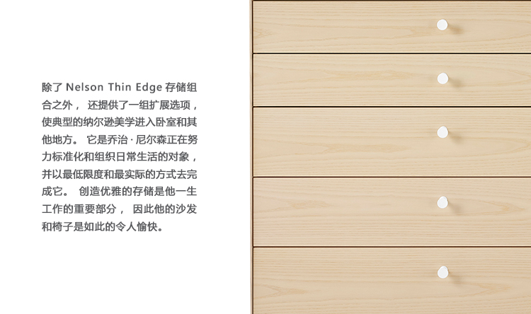 除了Nelson Thin Edge存储组合之外,还提供了一组扩展选项,使典型的纳尔逊美学进入卧室和其他地方。 它是乔治·尼尔森正在努力标准化和组织日常生活的对象,并以最低限度和最实际的方式去完成它。创造优雅的存储是他一生工作的重要部分,因此他的沙发和椅子是如此的令人愉快。