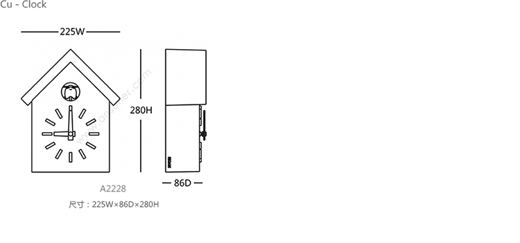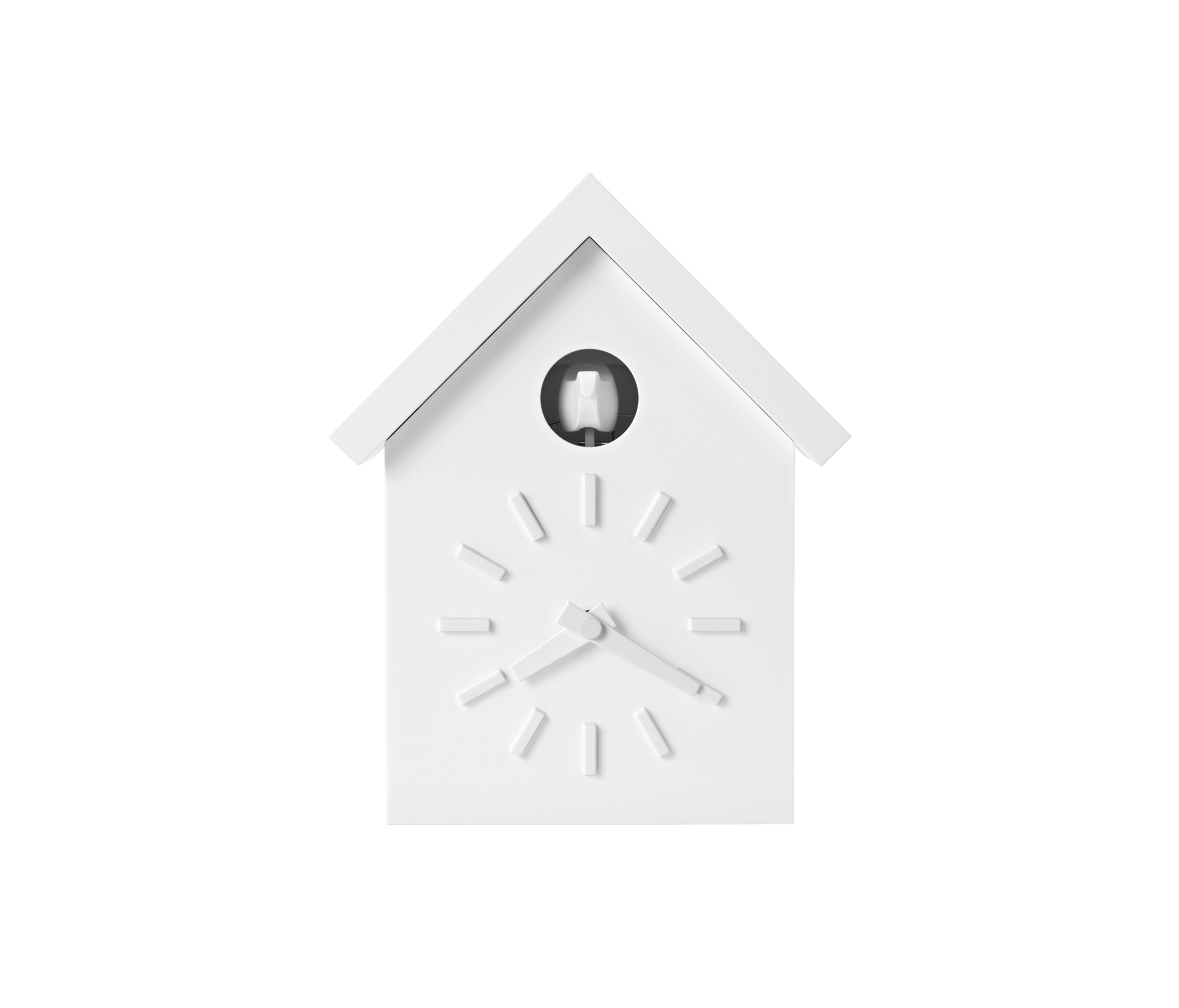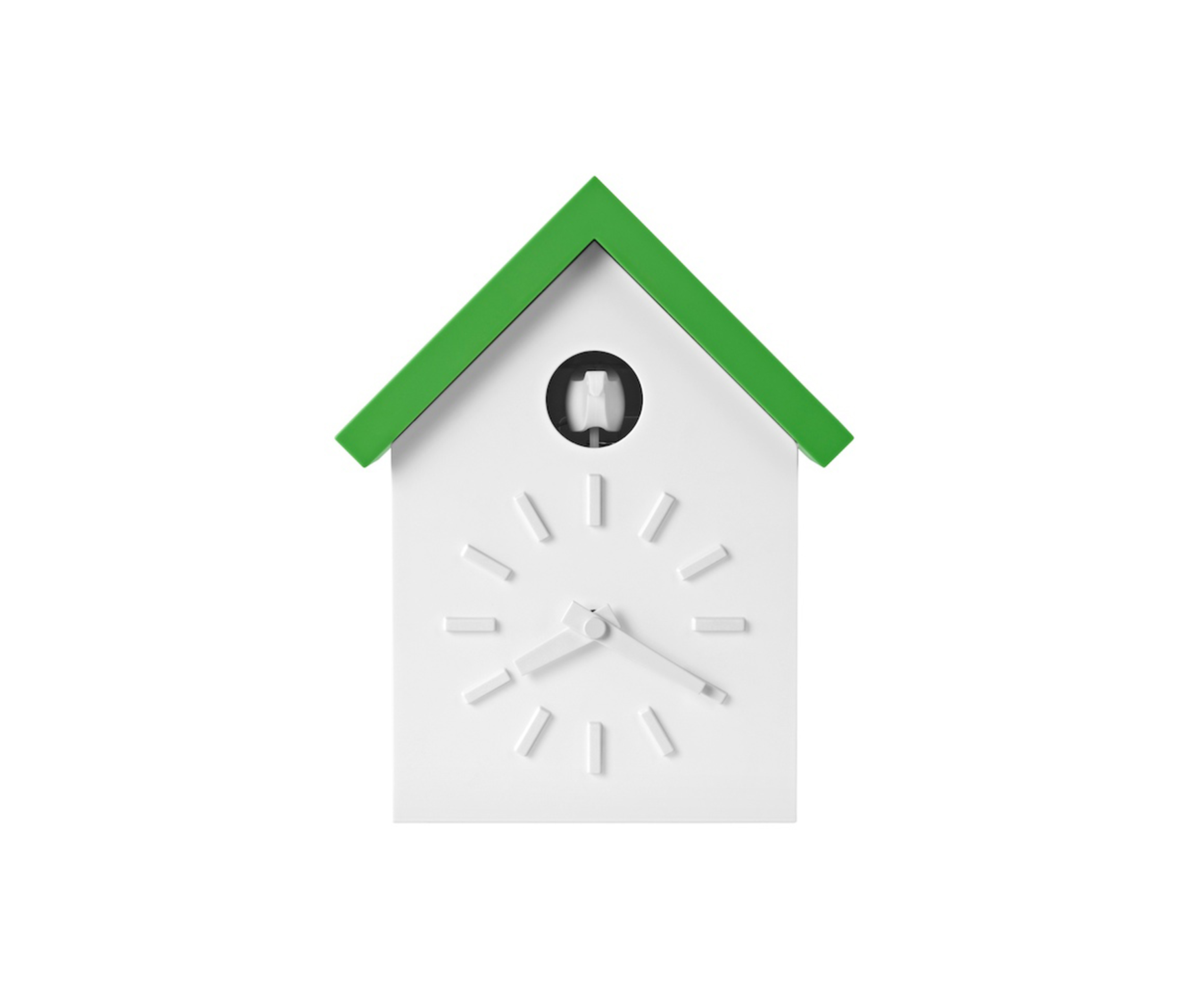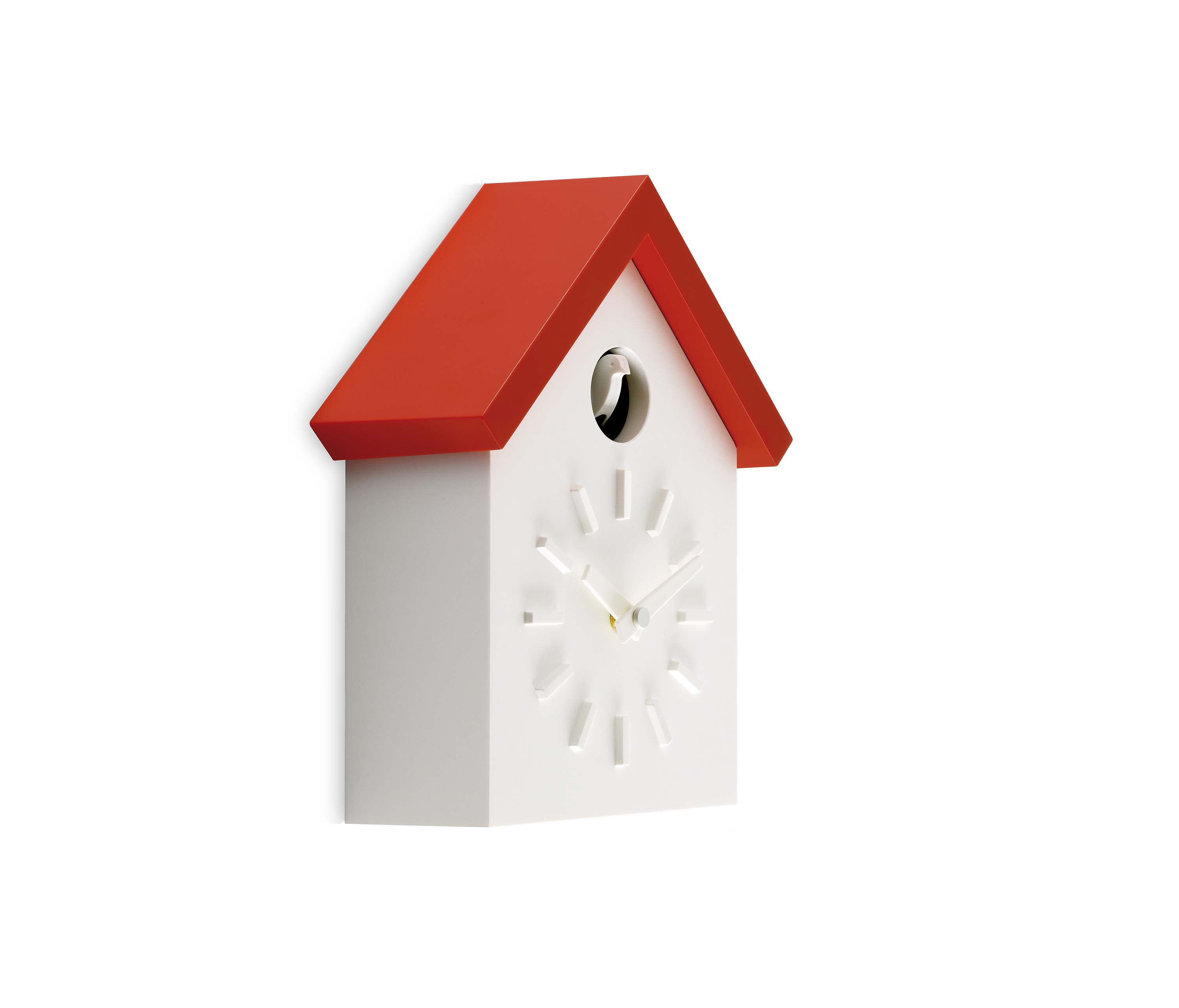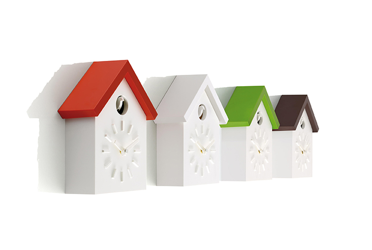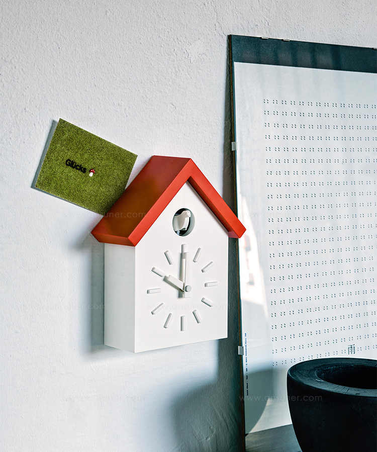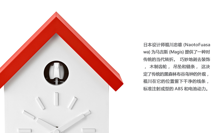 日本设计师福川忠雄(NaotoFuasawa)为马吉斯(Magis)提供了一种对传统的当代转折。巧妙地剥去装饰,木制齿轮,吊坠和链条,这决定了传统的黑森林布谷鸟钟的外观,福川在它的位置留下干净的线条,标准注射成型的ABS和电池动力。古钟是对传统、华丽的黑森林布谷鸟钟的简约诠释.一个简单的白色房子,有一个色彩鲜艳的屋顶,为一只小而抽象的鸟儿提供了栖身之所。白色铜钟-有一个屋顶白色,橙色或绿色-将在任何环境中增加幽默。