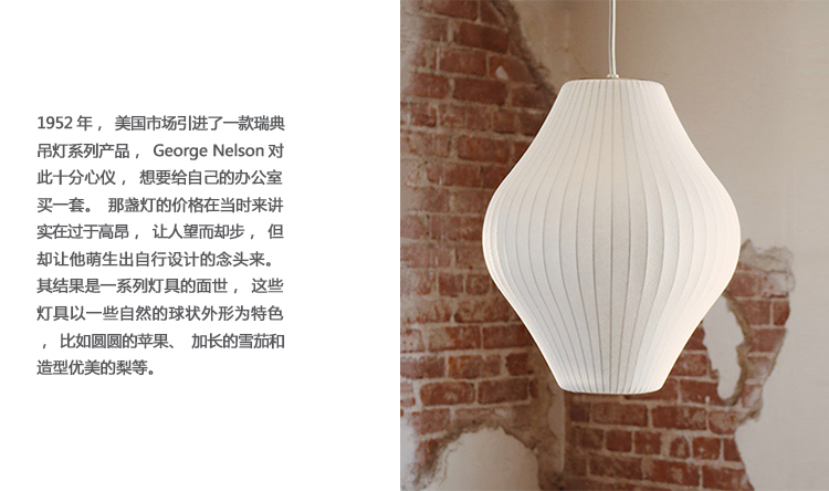 在基本的球状外形基础上稍作改变,气泡灯系列是George Nelson的设计中辨识度最高、最经典的系列之一。Nelson Pear Bubble Pendant梨形气泡吊灯悠然悬挂在头顶,向中心部位发散耀眼的光芒。本款吊灯有两种尺寸:小号和中号。1952年,美国市场引进了一款瑞典吊灯系列产品,George Nelson对此十分心仪,想要给自己的办公室买一套。那盏灯的价格在当时来讲实在过于高昂,让人望而却步,但却让他萌生出自行设计的念头来。其结果是一系列灯具的面世,这些灯具以一些自然的球状外形为特色,比如圆圆的苹果、加长的雪茄和造型优美的梨等。