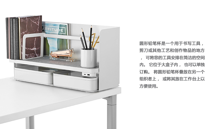圆形铅笔杯是一个用于书写工具,剪刀或其他工艺和创作物品的地方,可将您的工具安排在简洁的空间内。 它位于大盒子内,也可以单独订购。 将圆形铅笔杯叠放在另一个组织者上,或将其放在工作台上以方便使用。