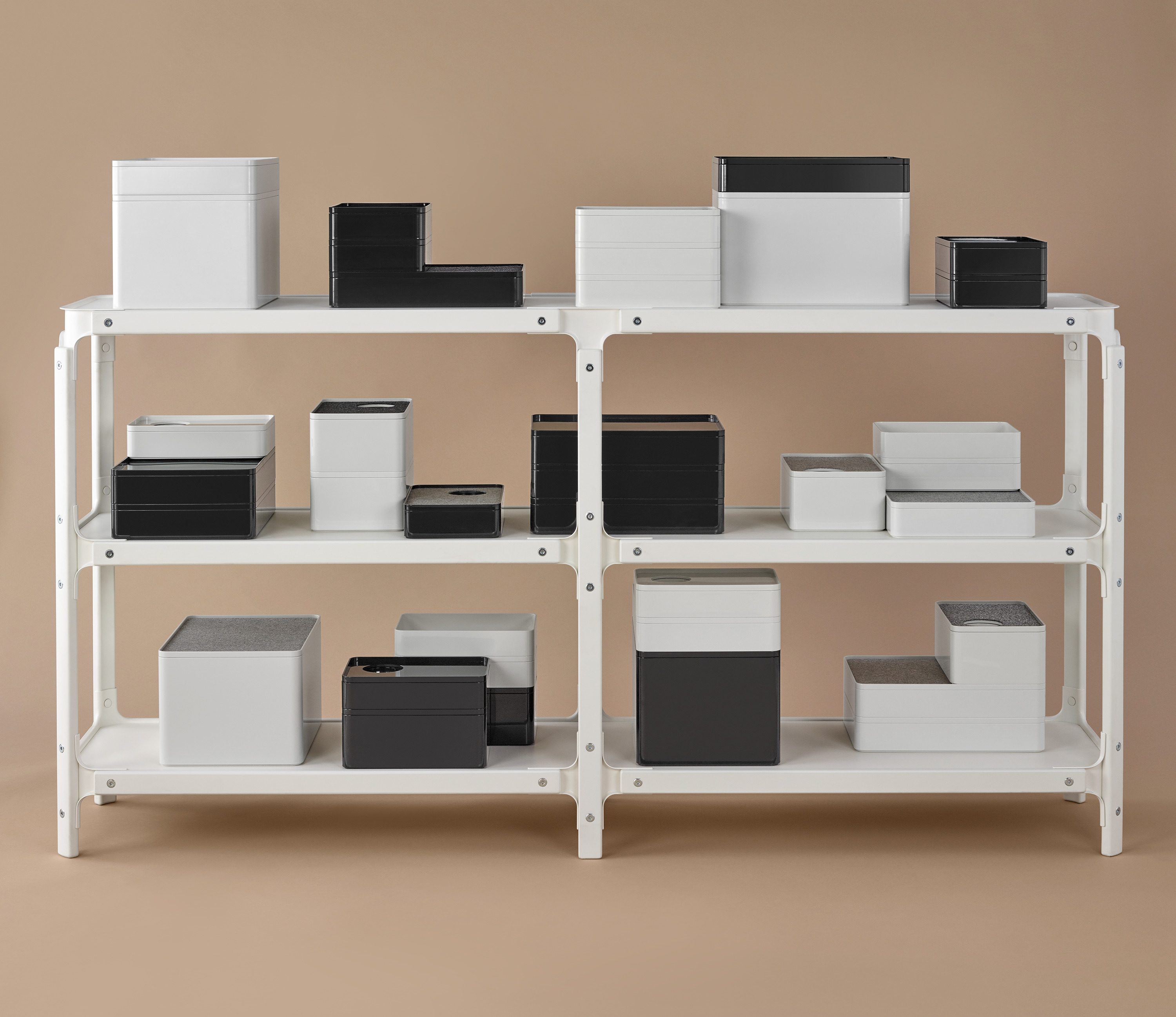 考虑到占据家庭及办公室空间的笨重物品的存放问题,Sam Hecht和Kim Colin设计了具有可拆卸盖子的储物盒。每个盖子上设计有孔洞,可供放置移动式笔筒。或者,笔筒可固定于储物盒内部孔洞下方压槽中,从而在无需打开盖子的情况下便可接触杯中物品。