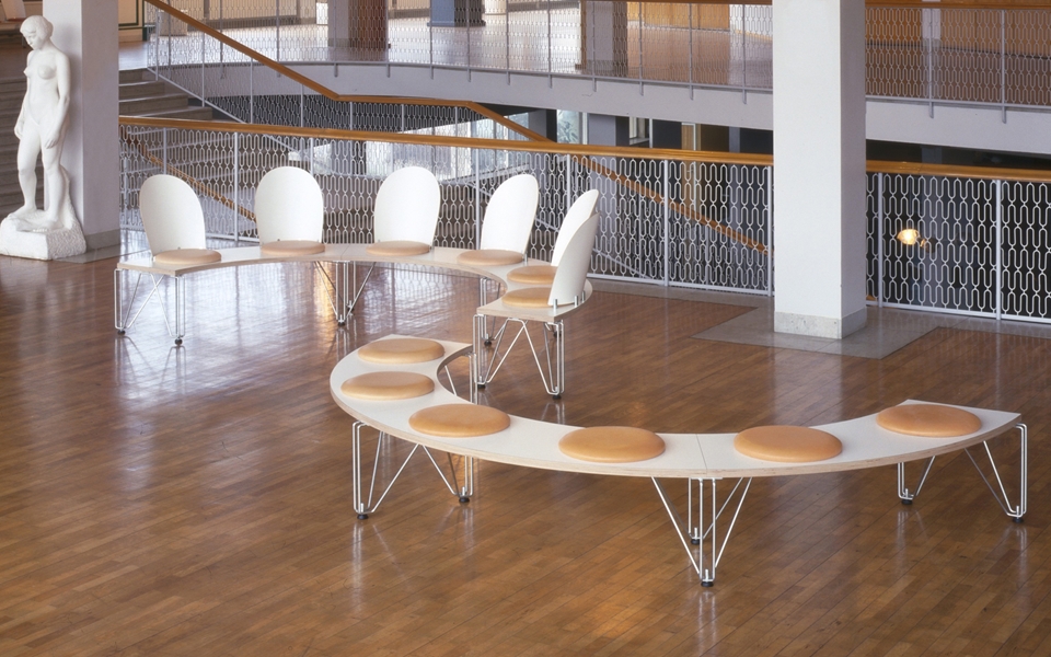伯格·林道· 约翰·林道(Börge Lindau, Johan Lindau)共同设计GATE,门是公共区域的可链接长凳系统。长凳有两个笔直和两个弯曲基本单元可用。使用门基本单元形成直行,弯曲或直角的行以适合其设置。可以根据需要配备靠背和/或座椅。座椅:圆形或直形软垫。靠背:圆形,直形,整体软垫。台式胶合实心桦木厚40毫米。镀锌钢框架。皮革或织物覆盖的软垫座椅。阻燃聚醚泡沫塑料内饰。压缩桦木靠背。座椅高度420 mm,总高度890 mm(含靠背),总深度460 mm,座椅Ø。 390毫米,CC座650毫米,长度,2座1200毫米,长度,3座1800毫米,圆形,1,5座45°,圆形,2座60°。