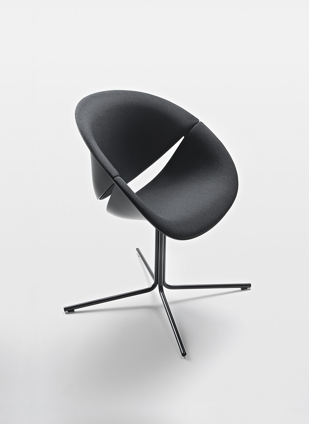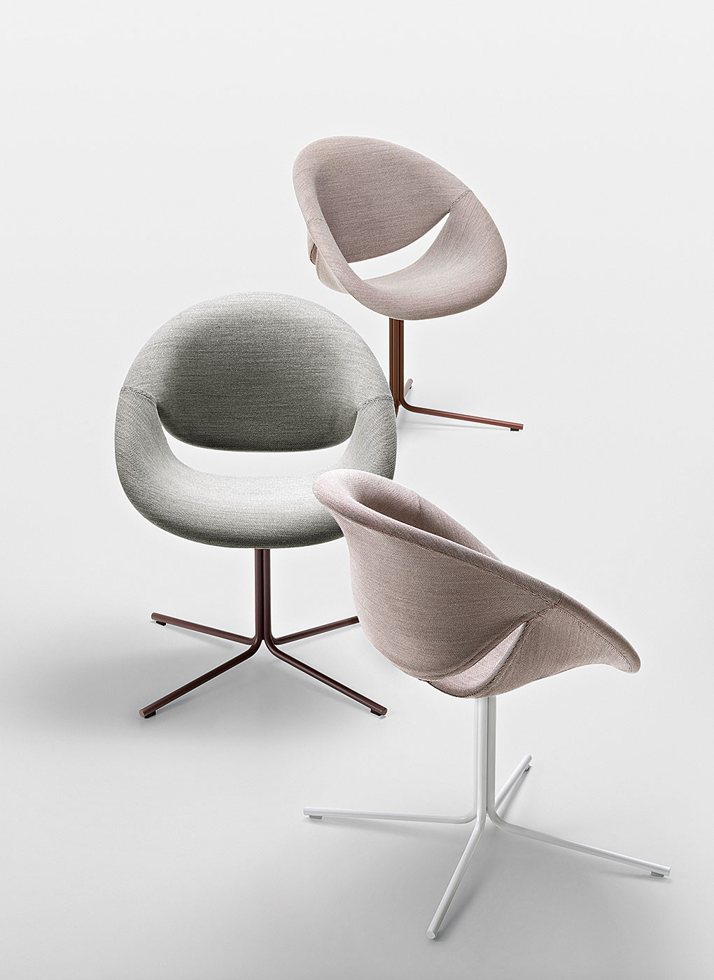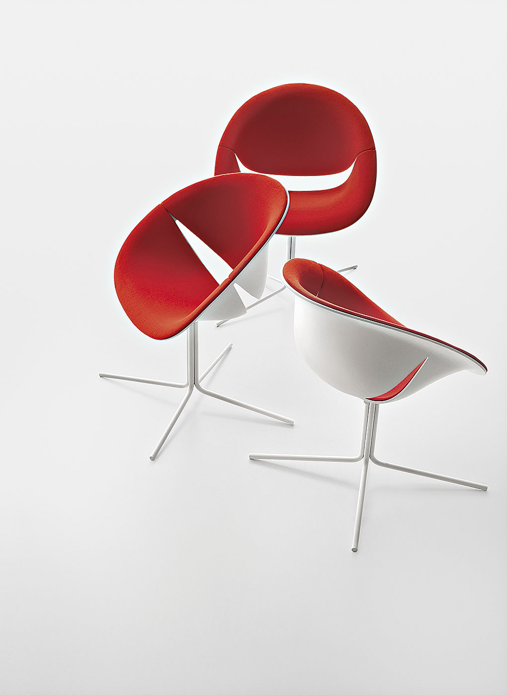 这把椅子的座椅和靠背组合在一起,露出微笑。如此幸福属于有趣的家庭想象,甚至更让人联想到彩色和覆层组合的多种可能性,从而可以个性化描述每种类型的环境。