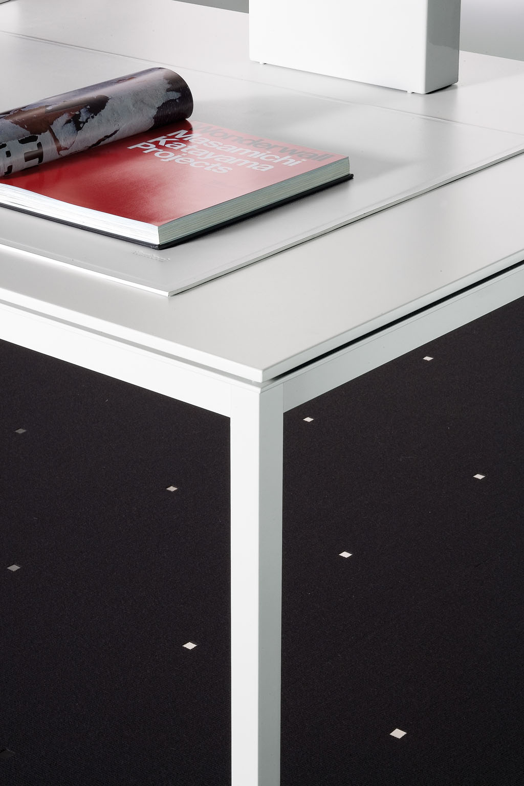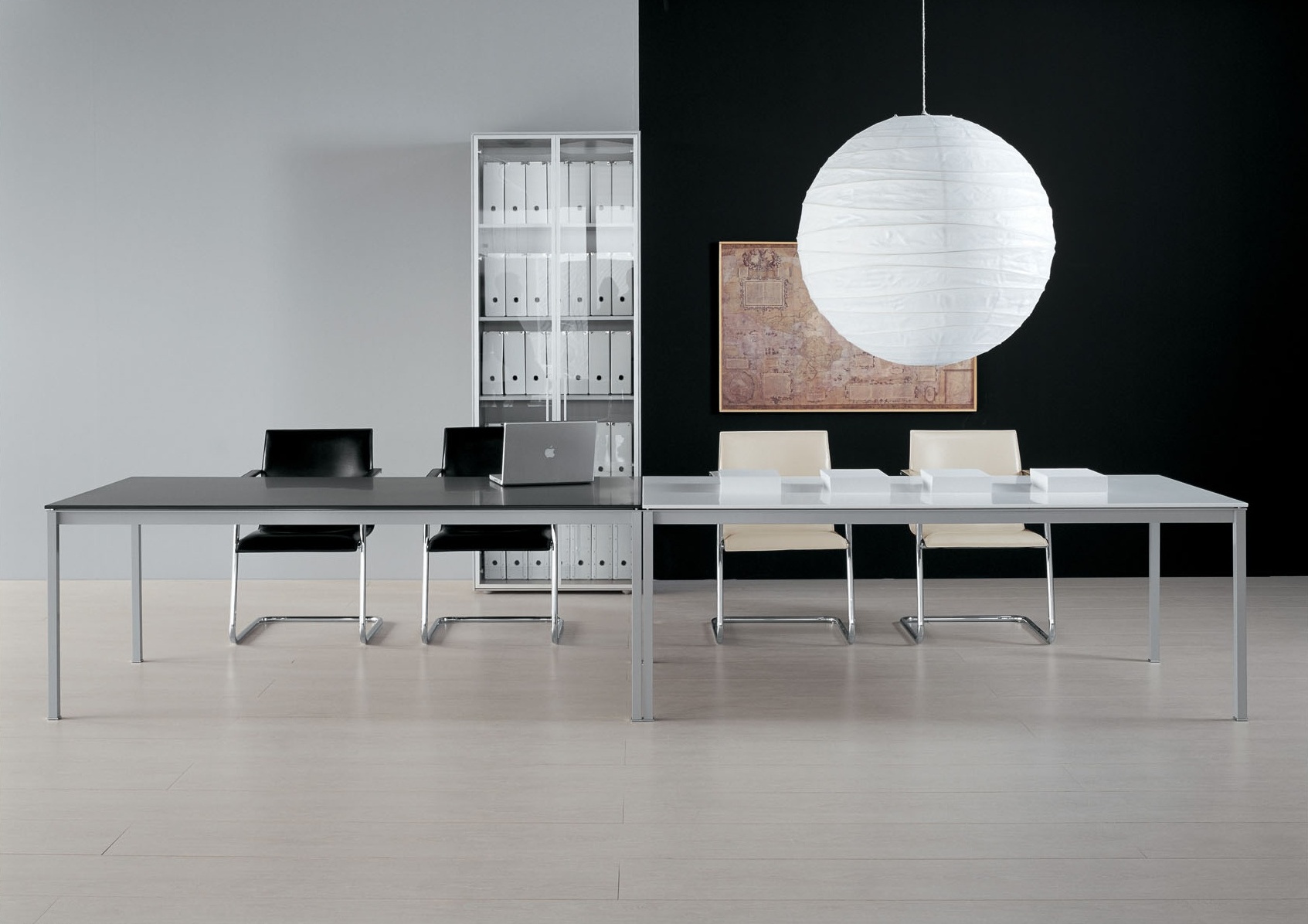 桌子的集合可在任何空间中脱颖而出,它们具有不可抗拒的简单性,并且在尺寸和用途方面具有极大的多功能性。它们的独特个性是由于使用了两种纯色-黑色和白色-以及三种顶部材料:涂漆Mdf,透明玻璃和磨砂玻璃。