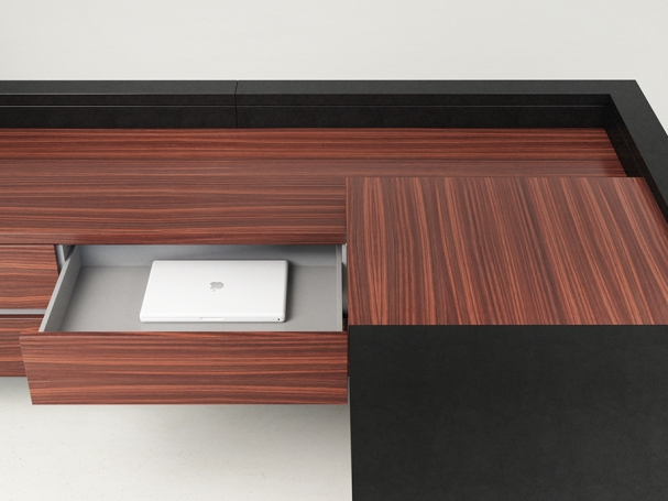 左副台带主机柜;左副台抽屉中可安装笔记本底座;右副台为储物柜.