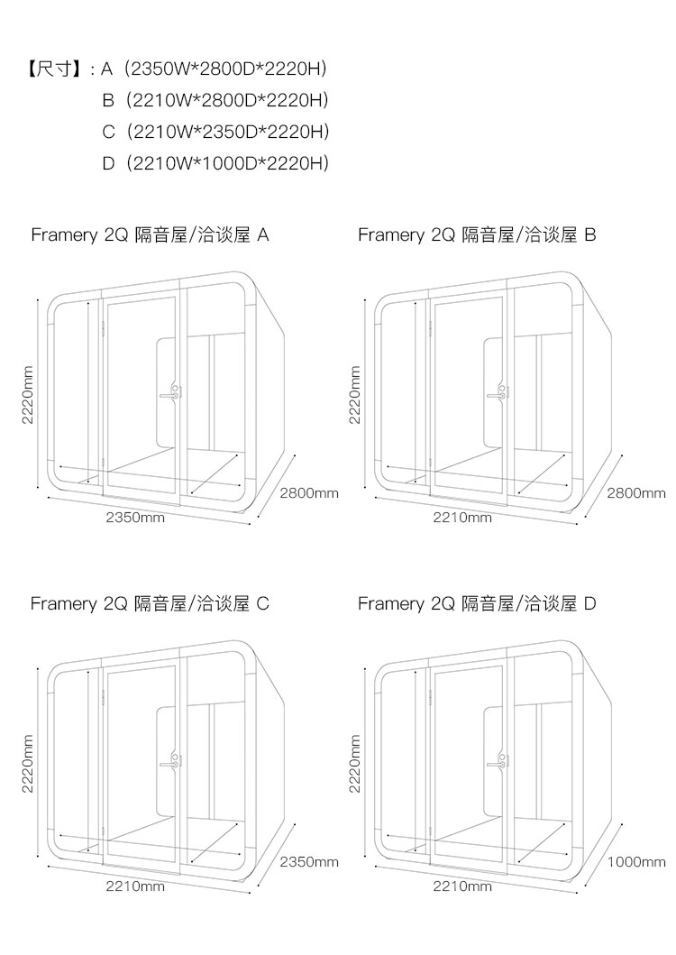 Framery 2Q 隔音屋/洽谈屋 系列尺寸/示意图