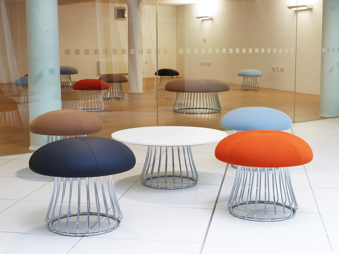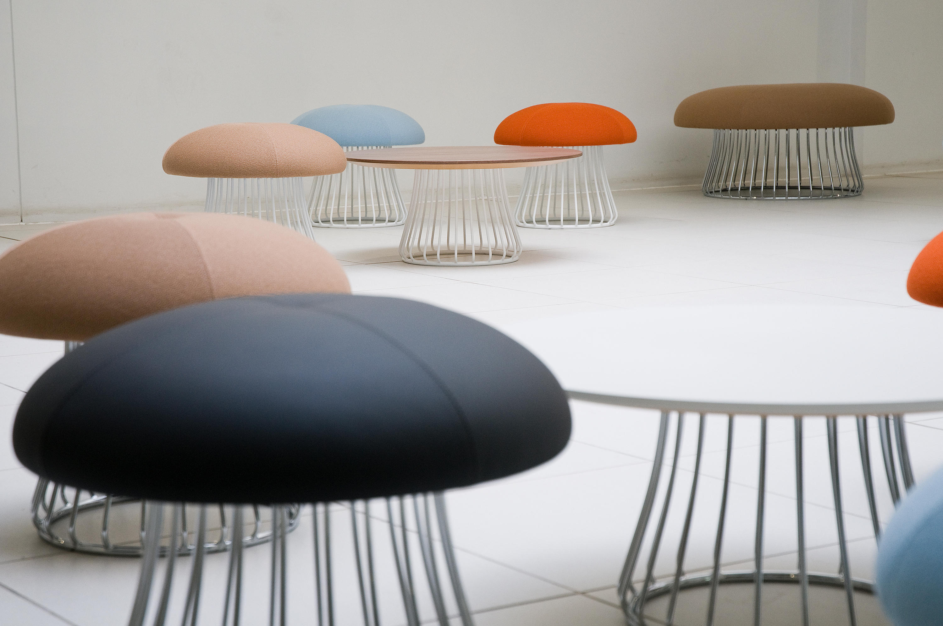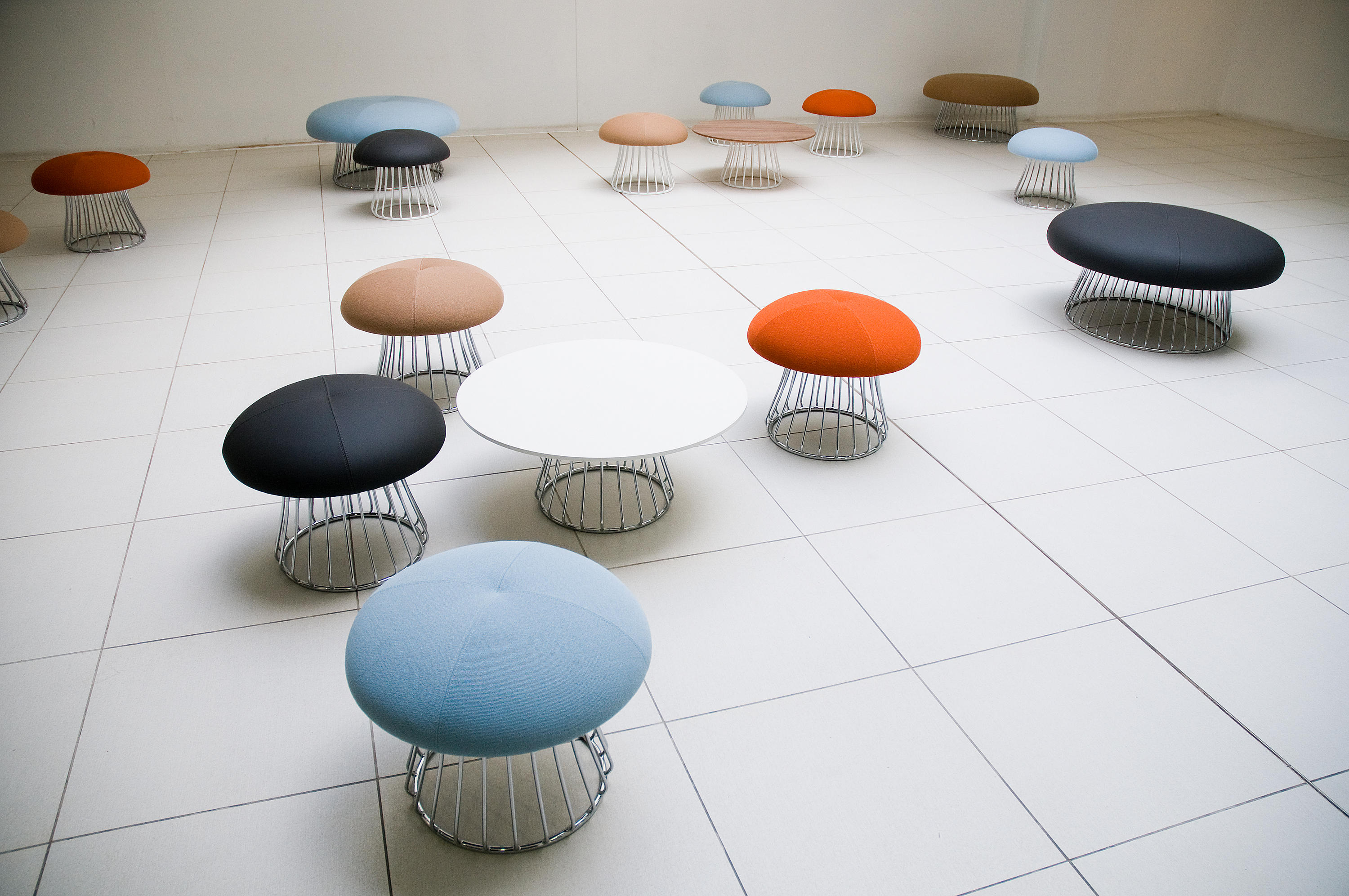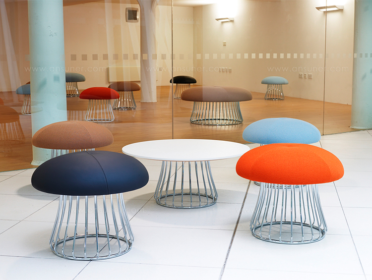魔术系列有凳子和咖啡桌,都是由一个白色或黑色镀铬脚架组成。