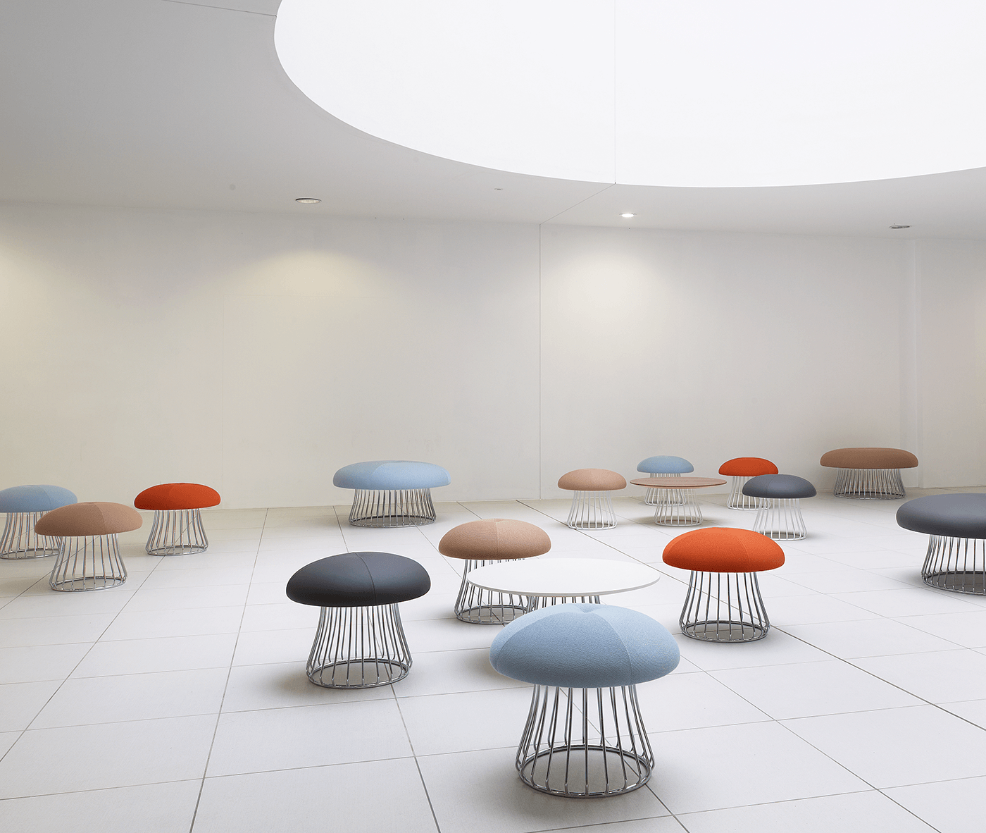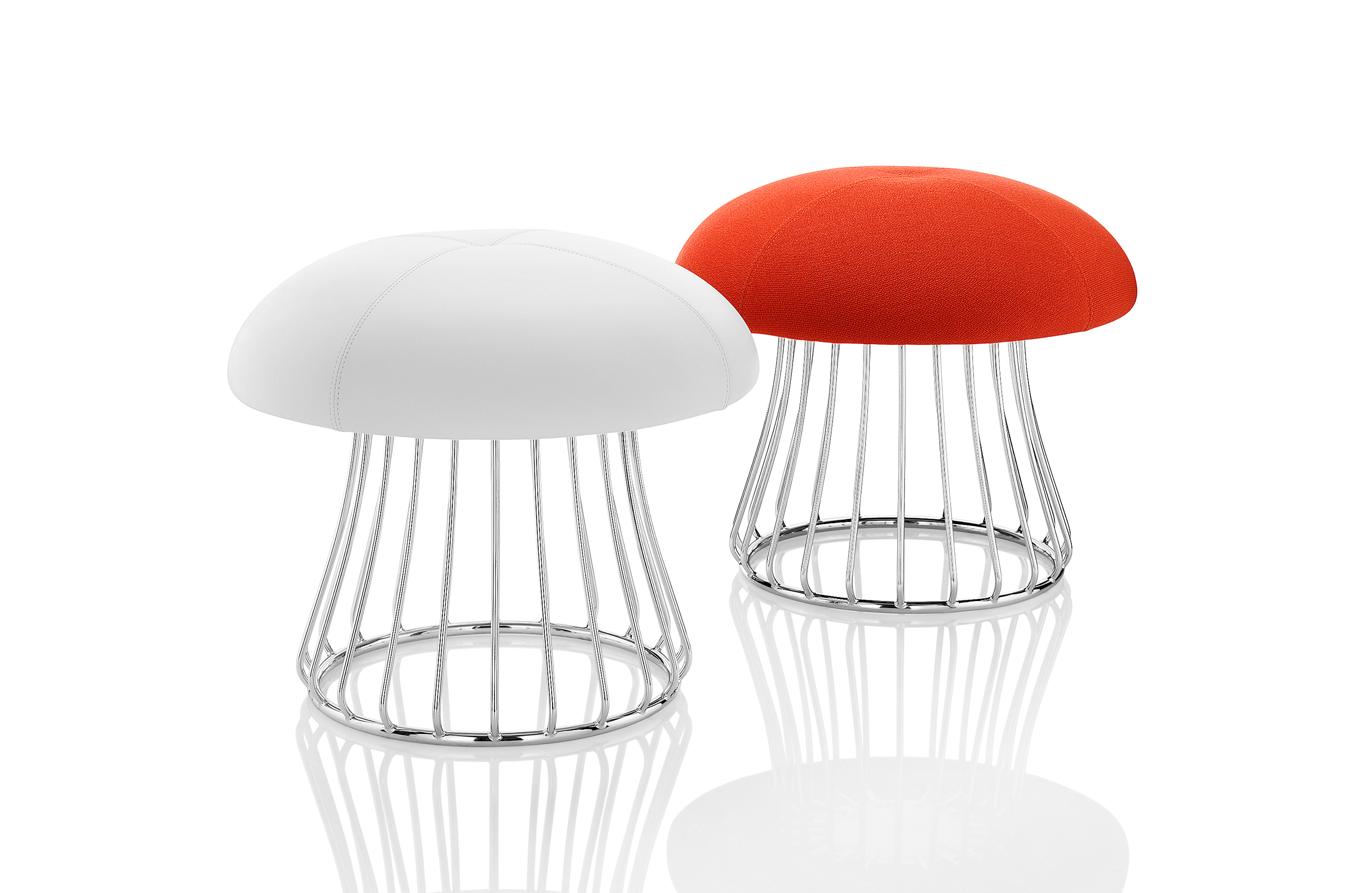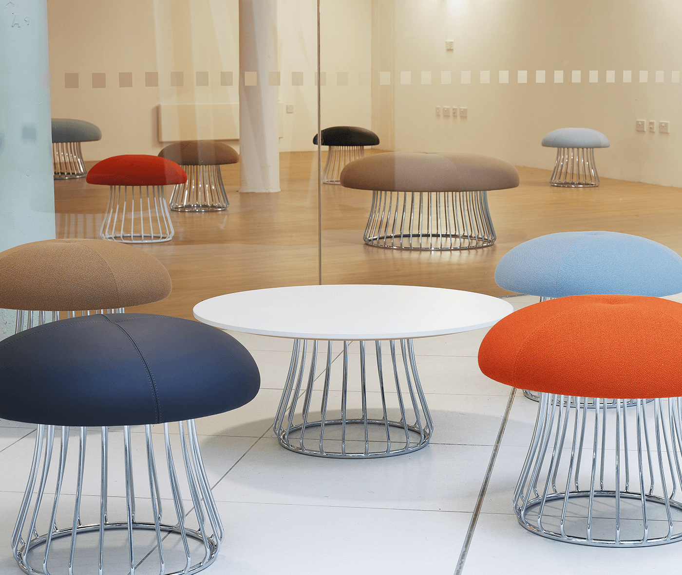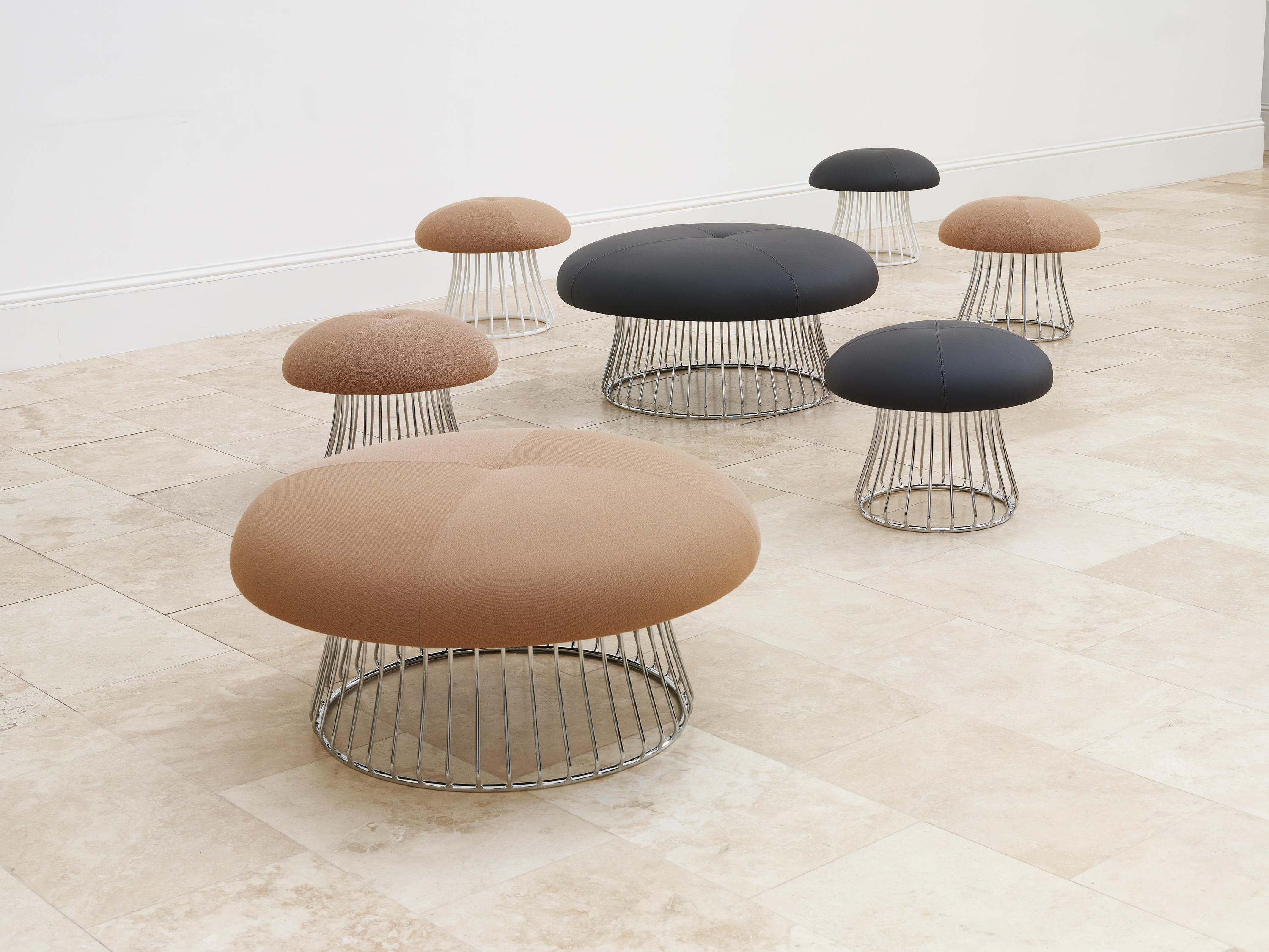 魔术系列有凳子和咖啡桌,都是由一个白色或黑色镀铬脚架组成。