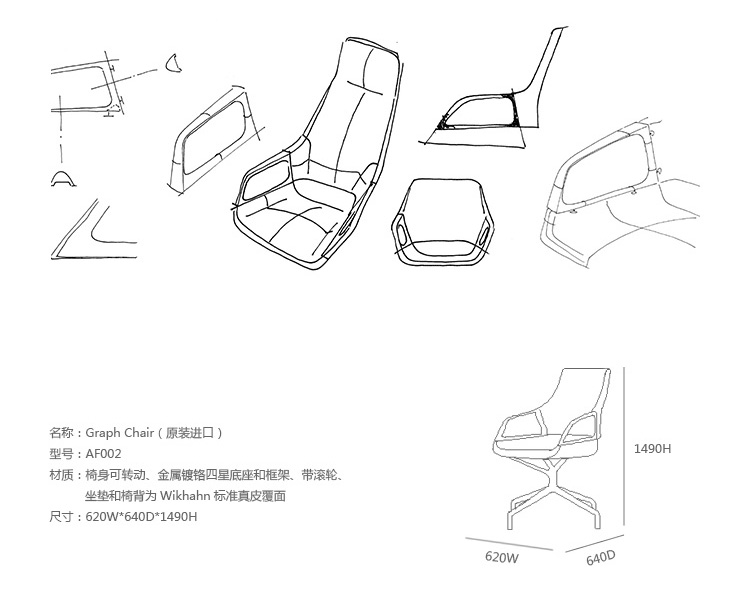 Graph椅是由设计师Markus Jehs 和Jurgen Laub为Wilkhahn公司设计的一款新型高档、舒适的椅子。设计的核心是一个可以分离的座套,并可自由组合,扶手成为座位与靠背的主要连接。其经典、独特的造型非常具有辨识度,开孔部分以及敞开的扶手可达到一个很高的视觉可视度。它原则性的好处就是可以很随意的结合不同的座椅和靠背高度,以创造出多种多样的座位模式,当然,舒适是首要满足的。Graph椅的设计概念结合了力学与三维设计之美。