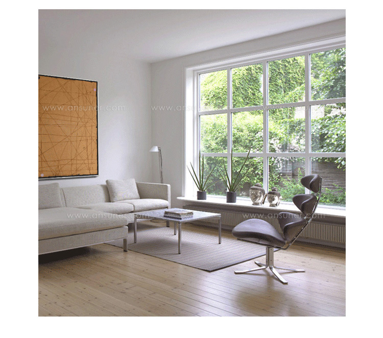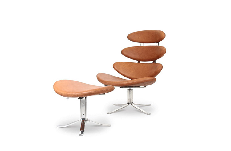 Poul M. Volther 于1964年的设计的王冠躺椅家具系列,是Poul M. Volther最知名的现代家具设计作品,此系列包括Corona Lounger Chair(王冠躺椅)、Corona Lounger Ottoman (王冠休闲脚踏)及其组合Corona Lounger Chair and Ottoman(王冠躺椅&脚踏)。历经40余年的今天,其作品在纷繁现代家具设计中仍占有一席之地。椅子充满了雕塑感,斯堪德维亚风格的简洁外形和舒适的坐感都是这张椅子成为创世之作的原因,四个椭圆形组成一张独特的椅子,无论摆放在哪,都令人过目不忘。此系列家具采用高强度钢材制作,表面电镀处理,外面为真皮或布艺制作,可360度旋转,不可后仰。适用范围广,酒店、会所、高档餐厅、夜总会、别墅等。