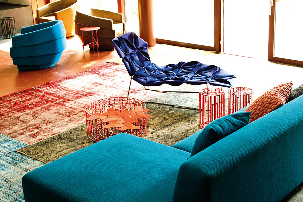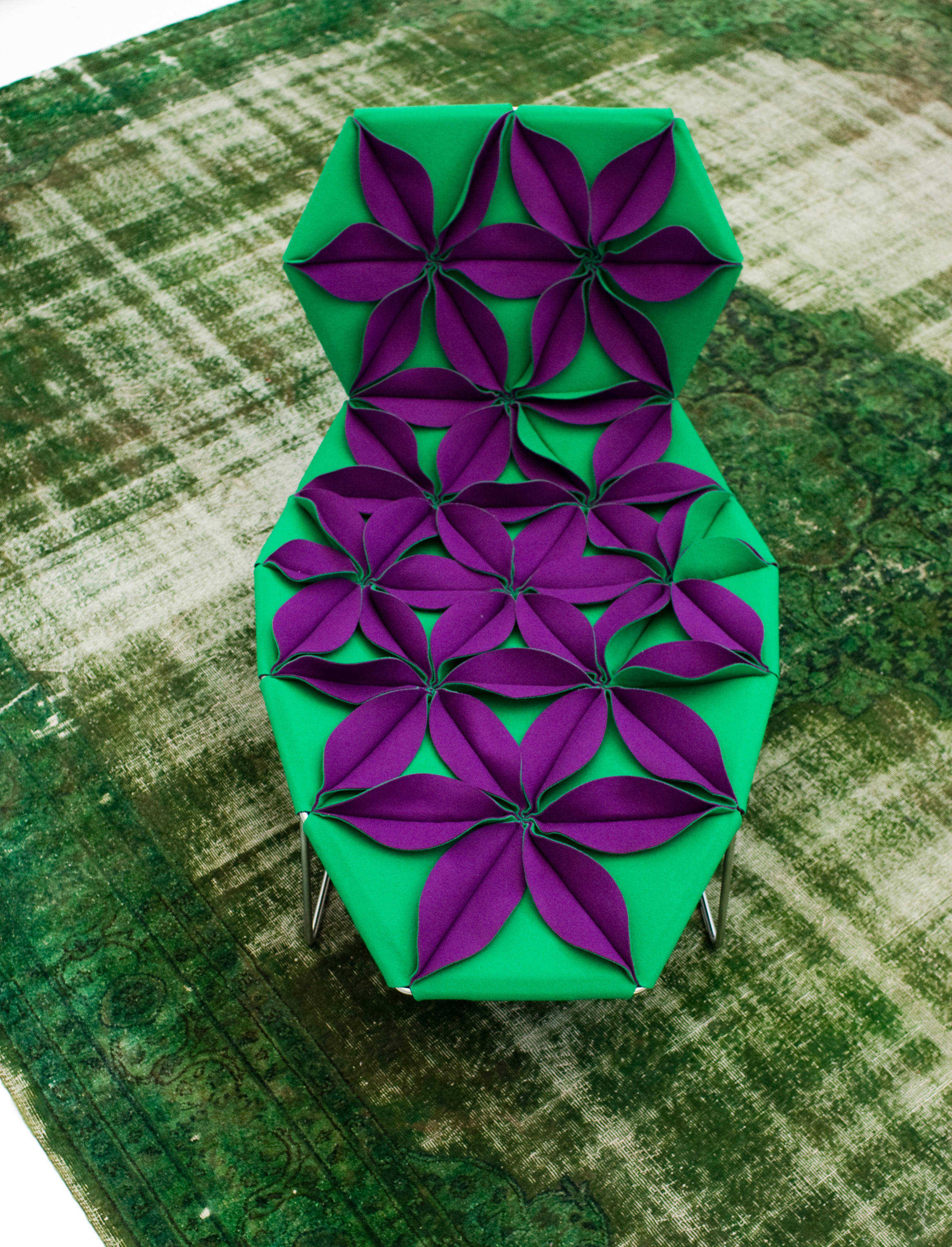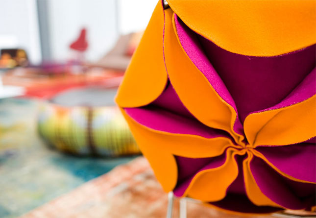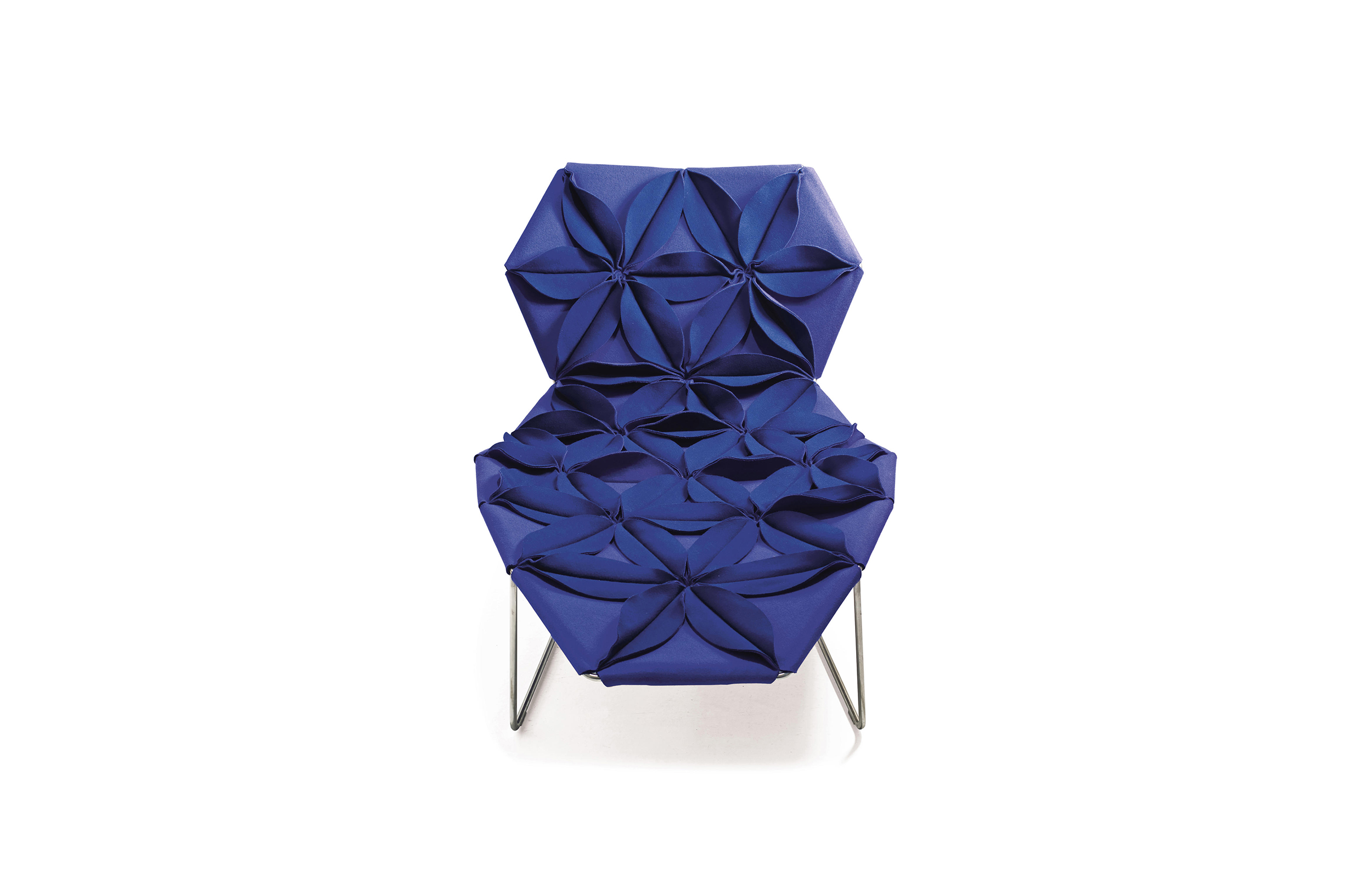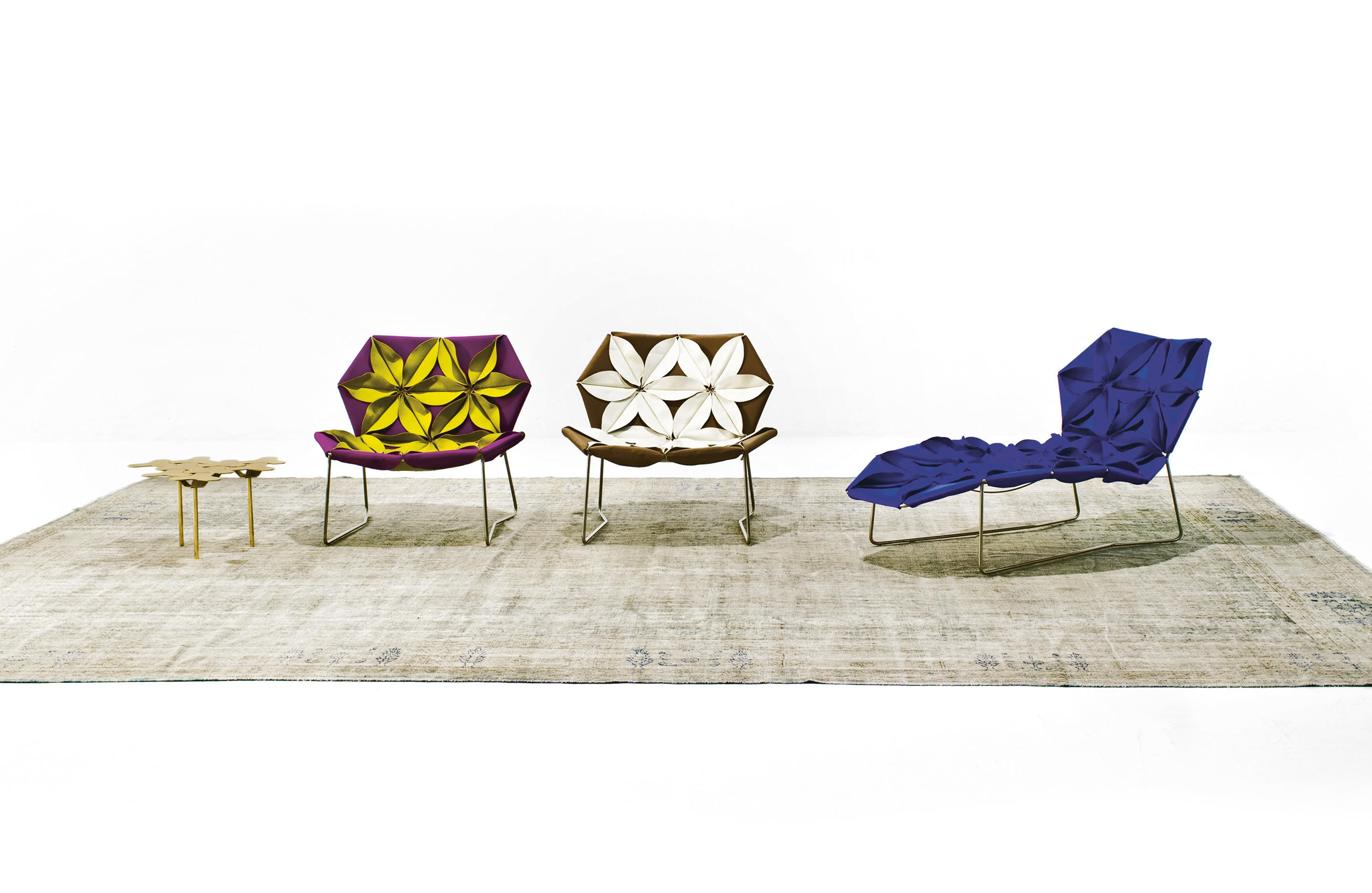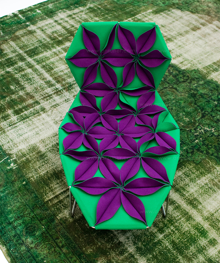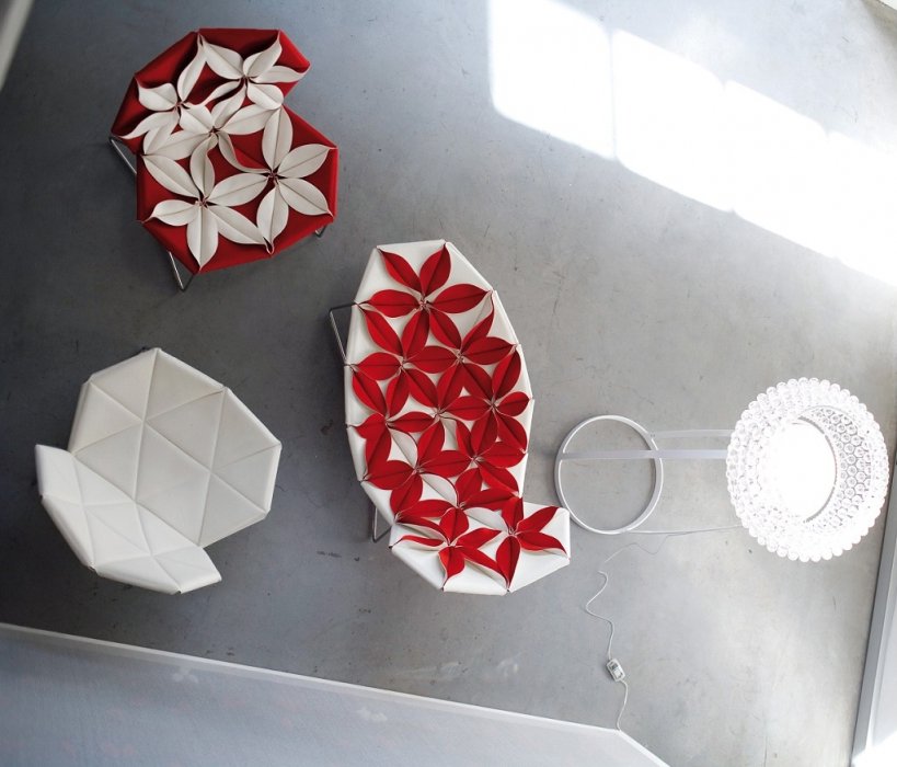Antibodi 是 Patricia Urquiola 從一個花朵盛開的概念所創作的椅子,蜂窩式三角形花瓣串連縫製而成花朵散播在椅面上,片片花瓣的外型和多層次的材料,衍伸出豐富的圖案。