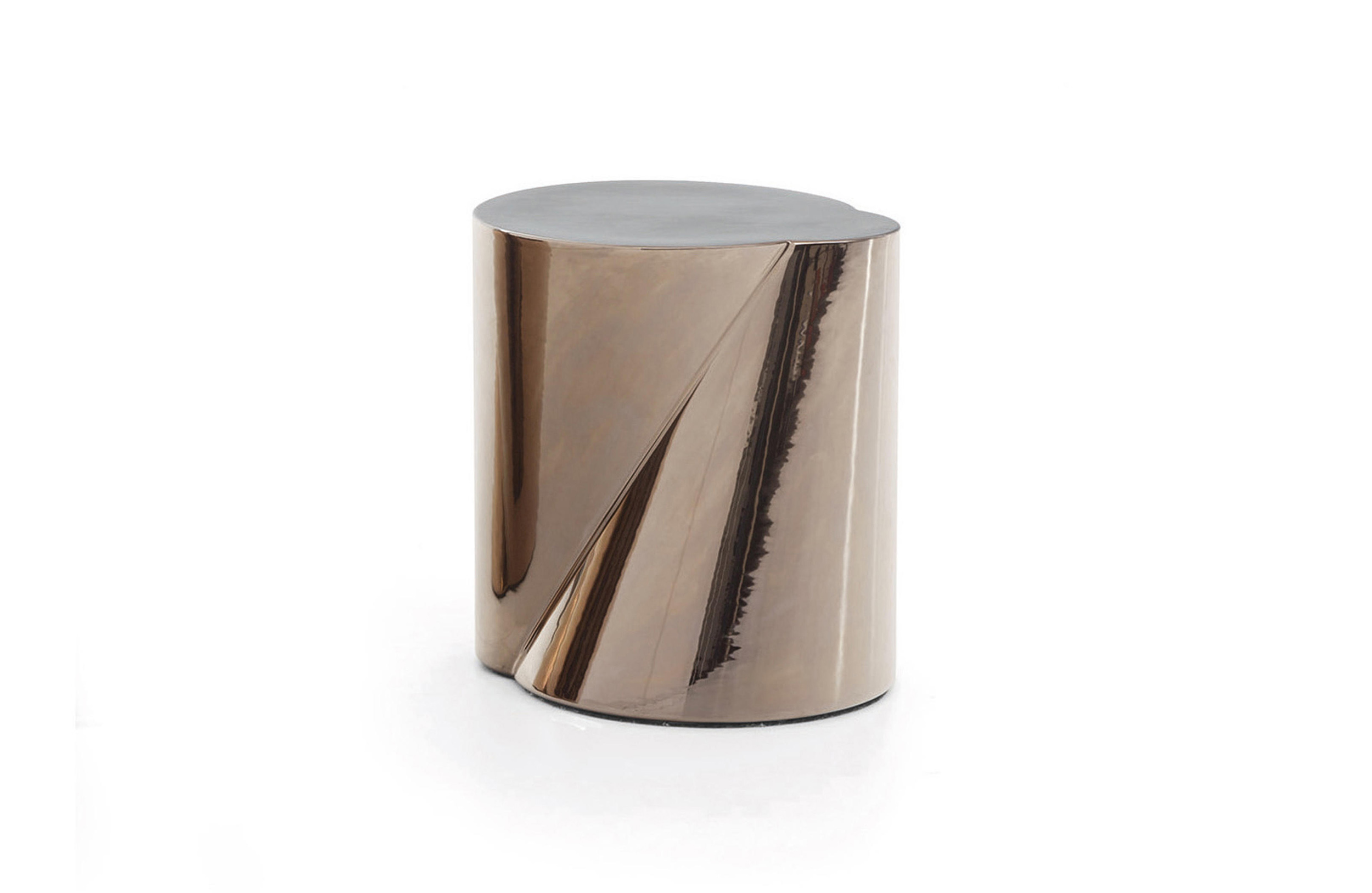 两个锥体连接在一起,打造出造型别具一格的边几,与此同时,两种金属饰面也体现出这款产品的非凡气质:铜色和铂金色。在经过玻璃化的工序之后,陶瓷还要经过进一步烧制,以此来熔化釉面的金属。