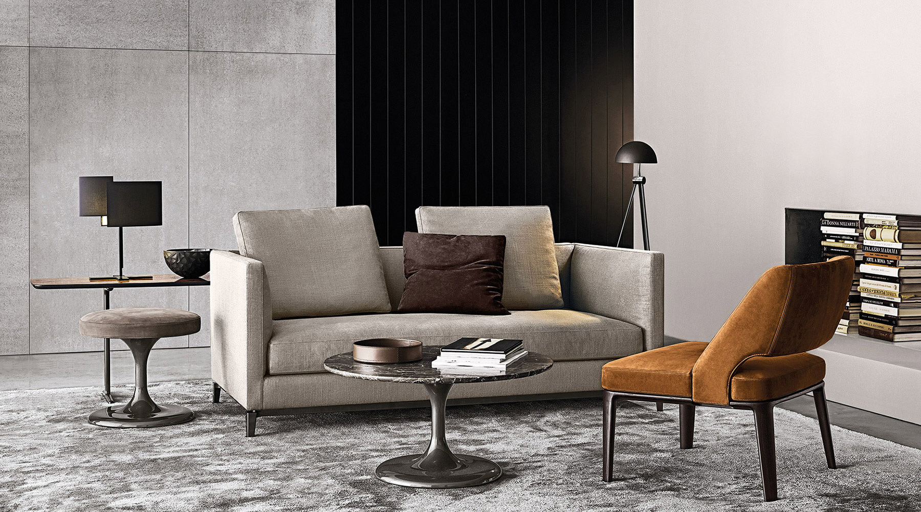 Neto是一组咖啡桌系列,有不同的高度可供选择,此外还有三种直径的台面以及三种不同的材料-颜色组合。如果基座和台面使用相同的颜色亮光漆(白色或Pewter色),以此来展现造型的纯粹感;另外,无论是基座为Pewter色,台面为Marron Damasco大理石的版本;还是基座为白色或Pewter色,台面为亚光漆面的花梨木的版本,两者都强调木材和石材这两种材质的珍贵性。“全白”版本则展现出Neto咖啡桌的可塑性。在亚光漆面的花梨木版本中,台面下方使用与聚氨酯基座相同的颜色,采用Minotti Studio的独家设计。技术与设计内涵在咖啡桌上展露无遗,体现出十足的个性,使其能够搭配系列中的任何沙发座椅。这款极具功能性的休闲凳属于Neto家族,基座材质为聚氨酯,漆面颜色为Pewter色,上方部件则添加填充物,包覆Minotti独家系列中的布料和皮革。Neto休闲凳是搭配LANE边几的理想之选,实际上,它也是一款万能单品,在任何环境中都能自如地展现魅力,与系列中的任何产品搭配都毫无违和感。