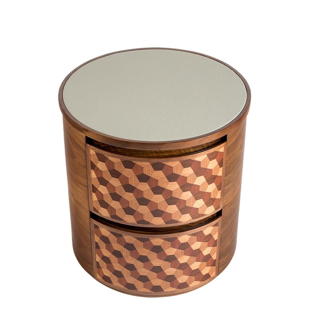 这款手工制作的圆形床头柜具有可定制的皮革顶部表面,包含整体复古感。