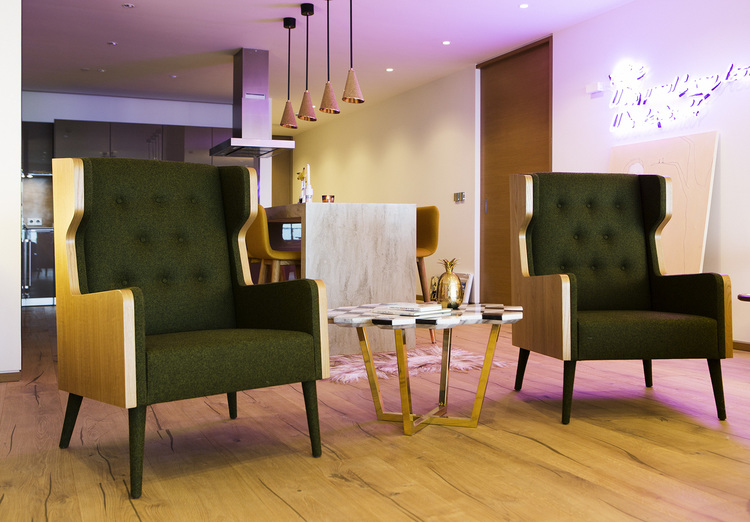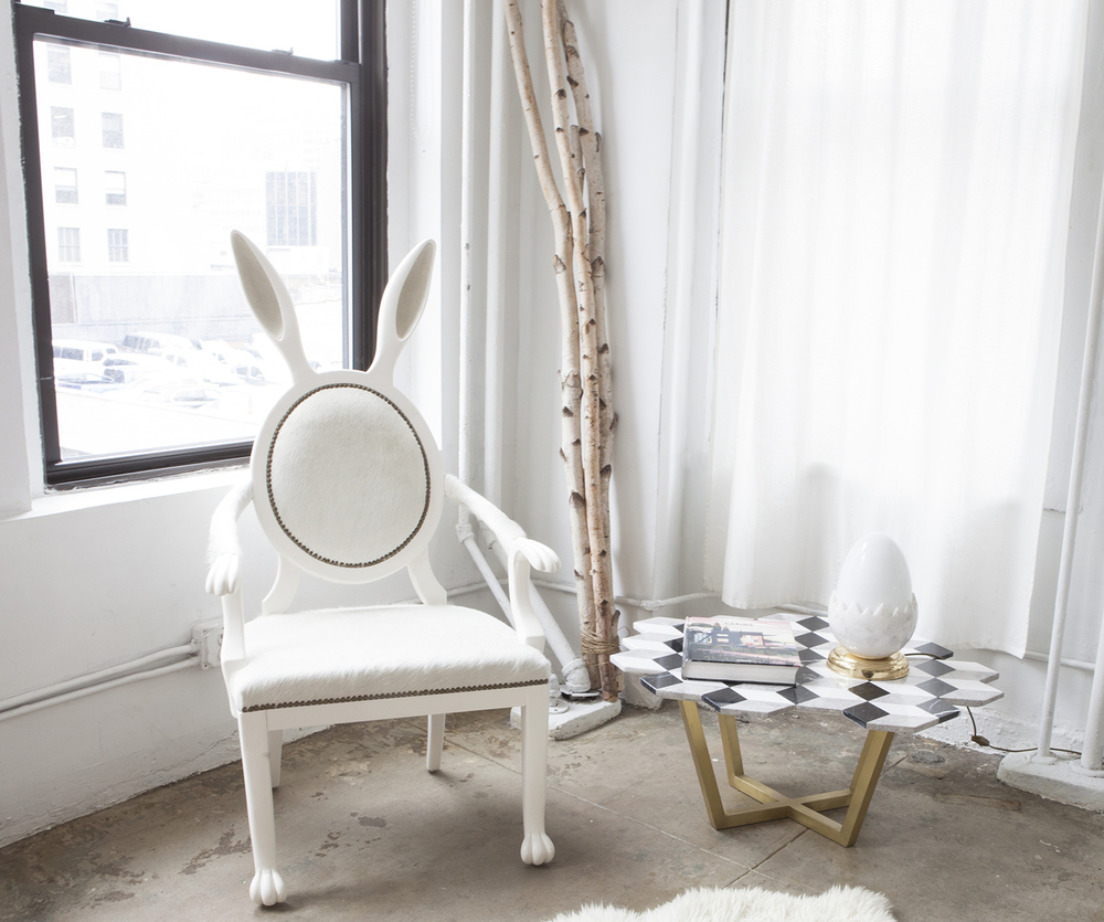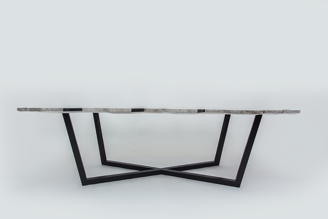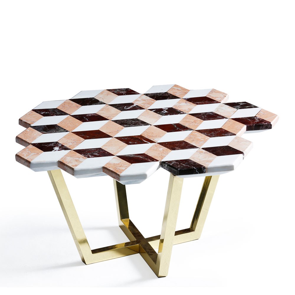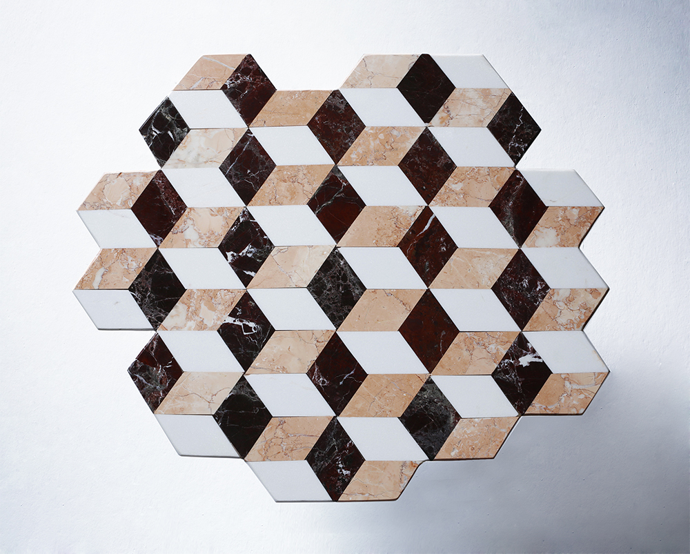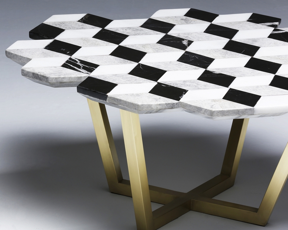 复视咖啡桌(Diplopia coffee table)是从创建一个传达视觉错觉的物体的想法中构思出来的。通过组合不同种类的大理岩产生立体效应。大理石桌面的不对称形式增加了复视的幻觉。复色的单色和彩色版本是用抛光或未抛光的铜腿制成的。更大的尺寸可根据要求提供。