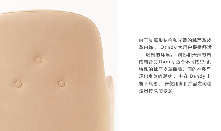 由于其弧形结构和光滑的绒面革皮革内饰,Dandy为用户提供舒适,轻松的环境。 浅色和天然材料的结合使Dandy适合不同的空间。 特殊的绒面皮革随着时间的推移呈现出身体的形状,并在Dandy上留下痕迹,在使用者和产品之间创造出持久的联系。