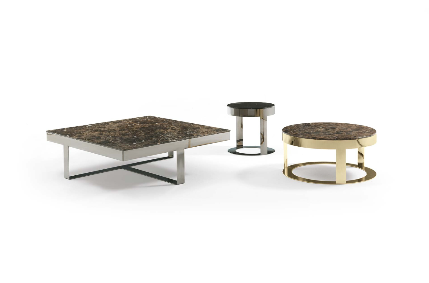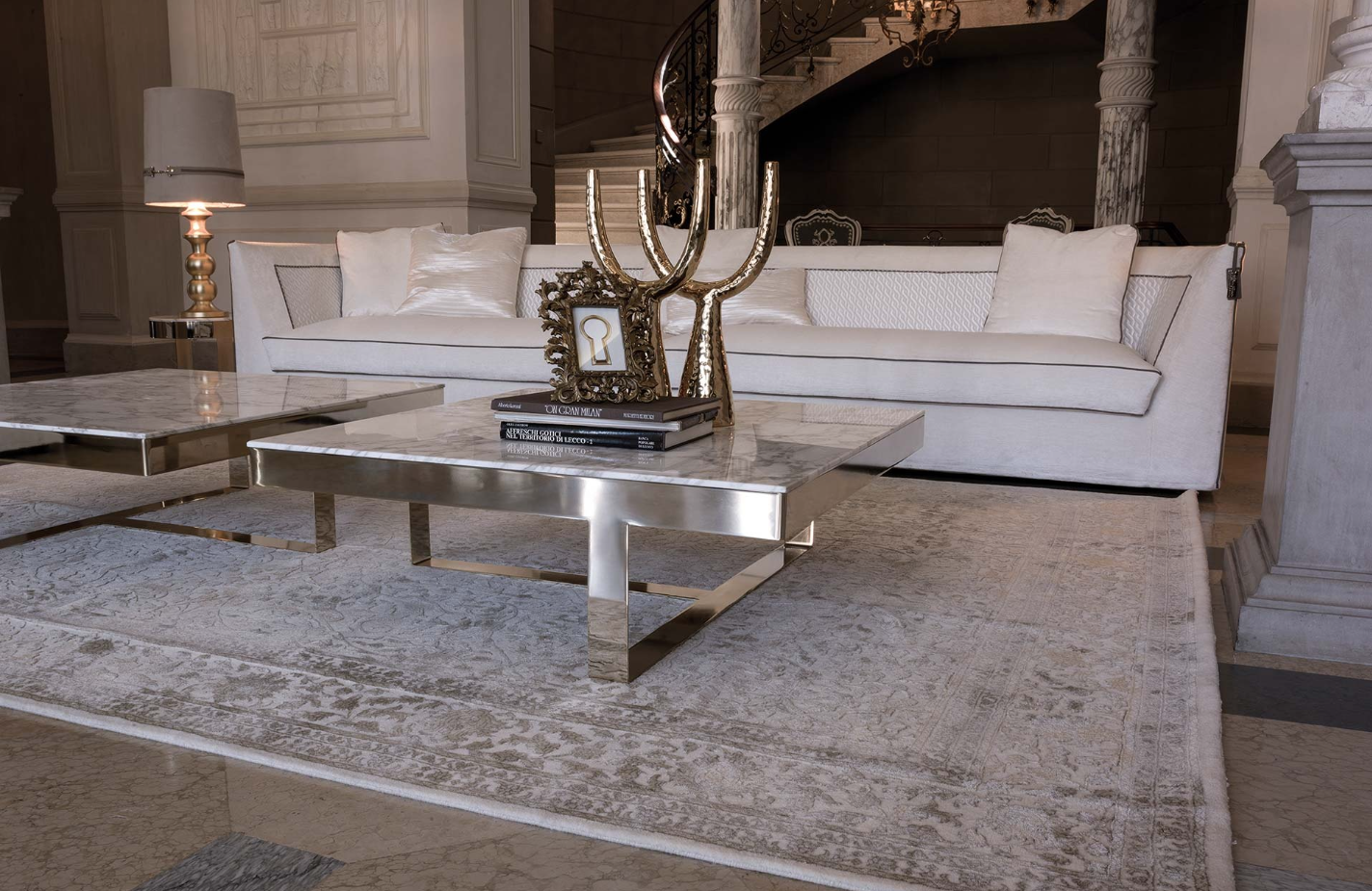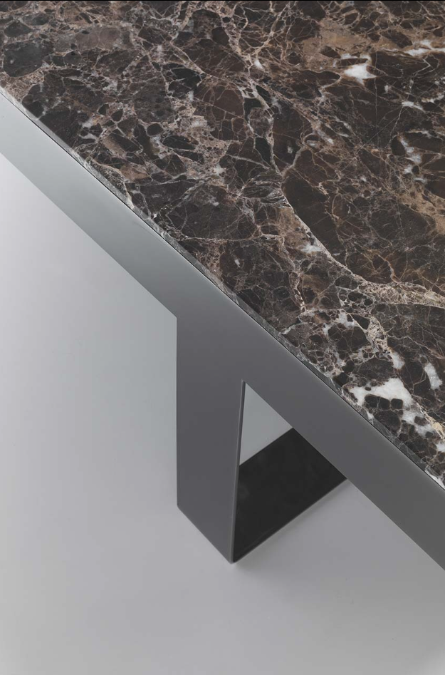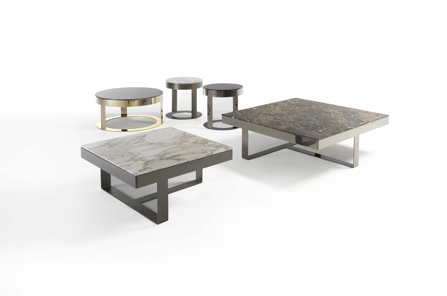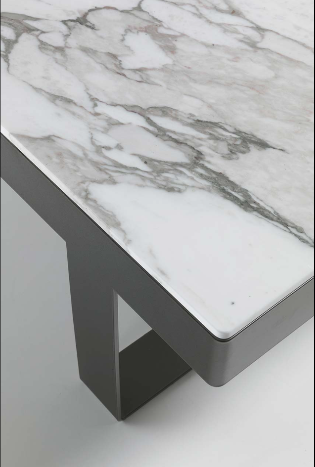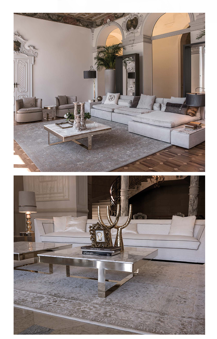 无论是正方形还是圆形,它把大理石的光泽和精致的金属底座或皮革的温暖结合起来。