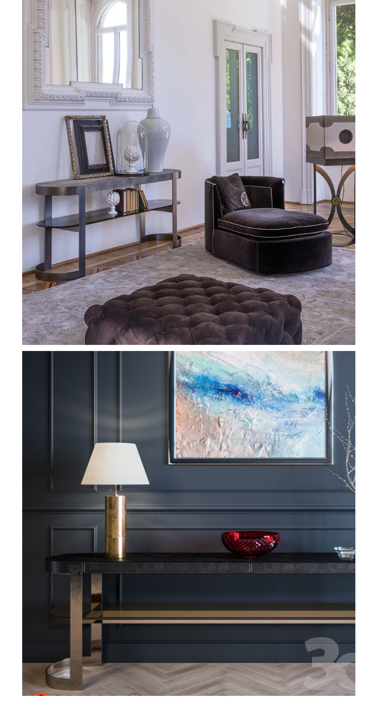 一种控制台,其基本轮廓将大理石或皮革与玻璃和金属相结合,以达到形式上的完美。