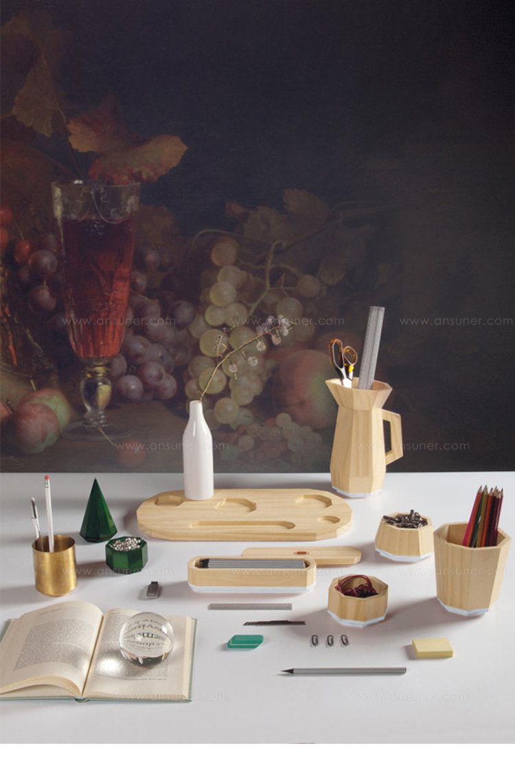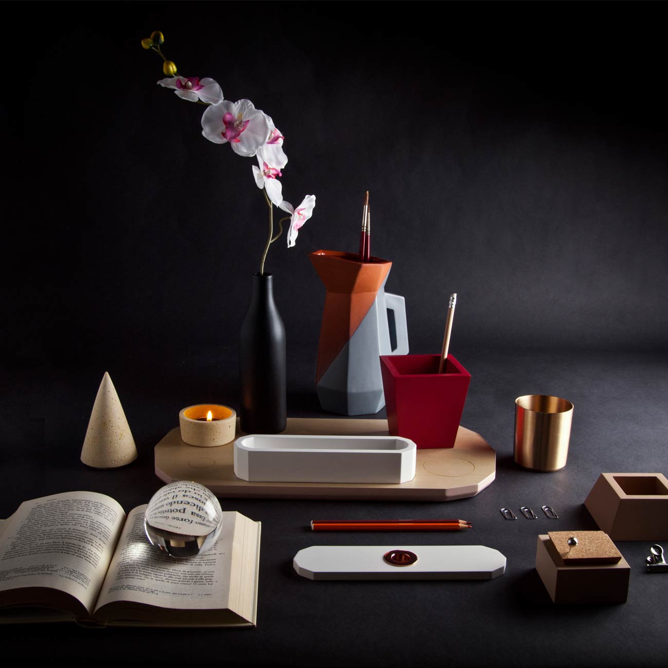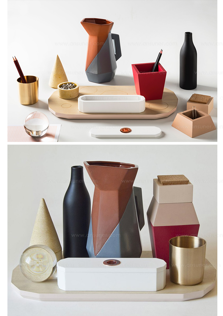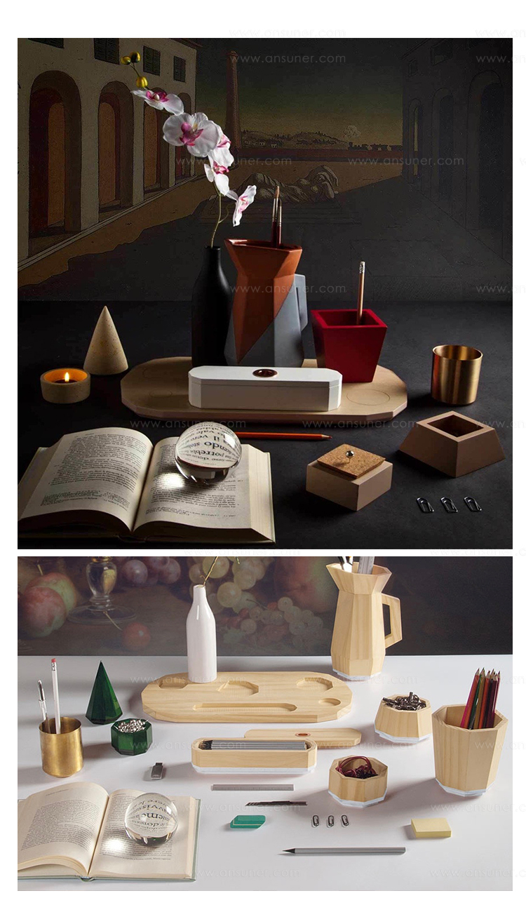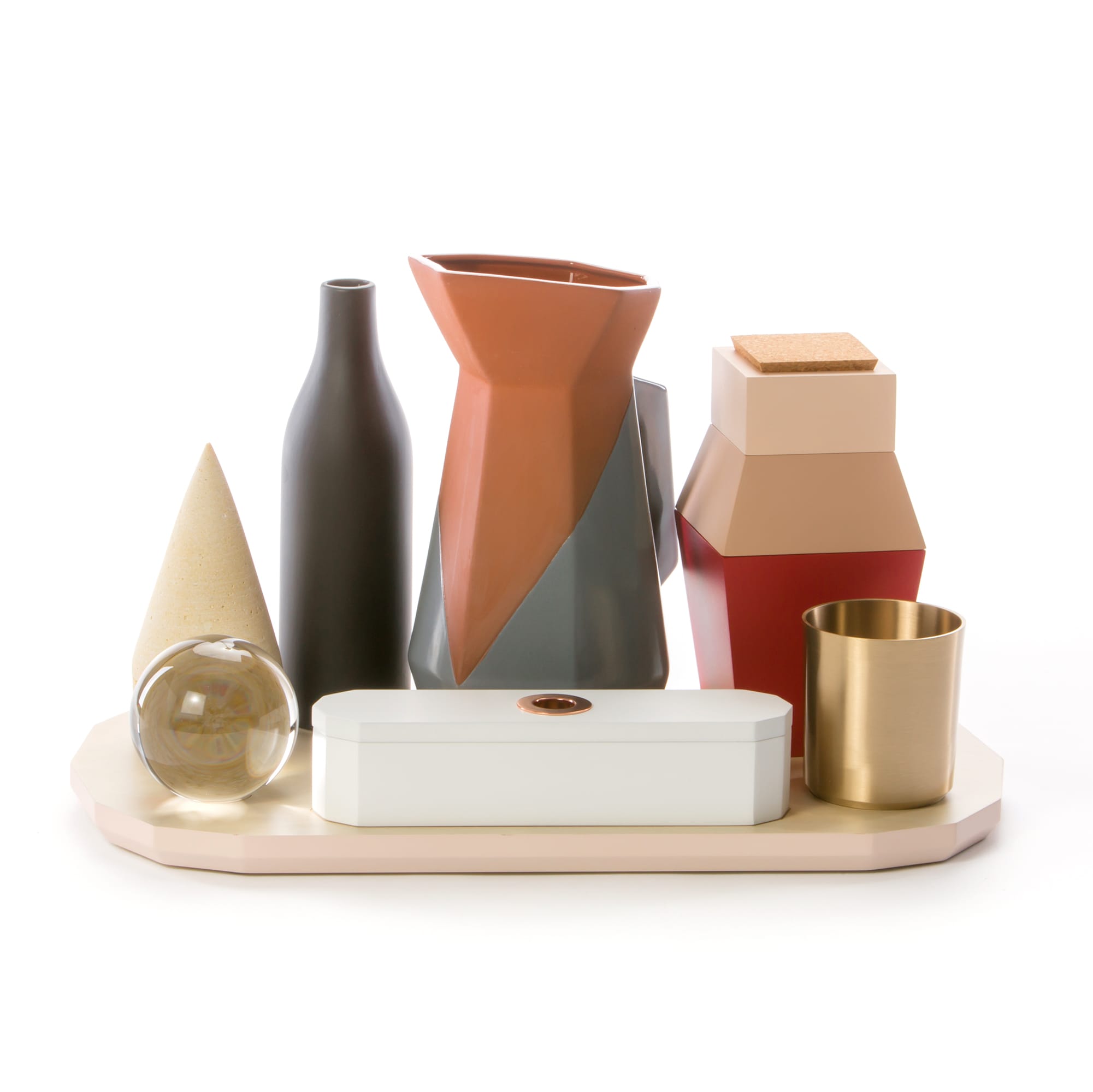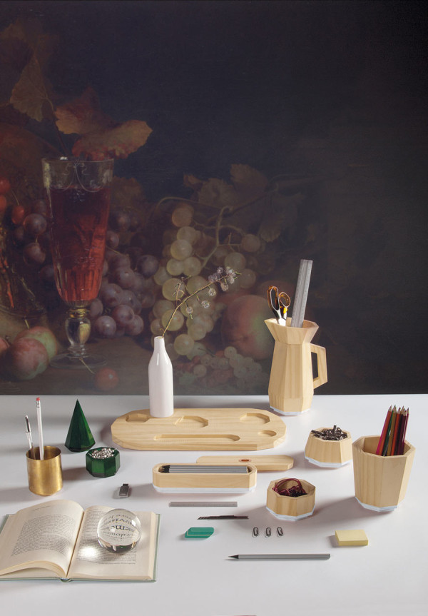 桌面集由一组对象组成,其特征在于使用不同的材料来创建不同的使用形式。 木材和软木的自然性与聚乙烯的当代性质相对应; 陶土的质地与玻璃和瓷器的精致混合。 具有几何形状和温暖的柔和色彩的花瓶,容器,玻璃和镇纸组合成功能性和装饰性。 桌子采用休闲和俏皮的色调。
