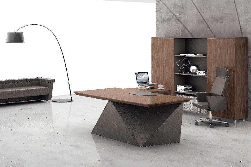 威睿系列,最大的亮点是独特的切割面。打破整体划一的家具造型模式,采用几何体构造设计手法,大尺度楔形宽体切面造型,如钻石的刻面与腰面错落有致,造出流畅的线条感。将现代建筑设计元素融入现代办公空间,结合整体布局配套延展,打造办公家具时尚前沿。主桌采用皮木覆膜工艺,机车缝合明线效果处理,浅胡桃皮木与皮椅搭配,整个空间充斥着个性化对比,金属材质简洁明快,流露出一种低调的奢华与睿智,配合银灰色的空间墙面,使得办公家具与整体的风格一脉相承。"
