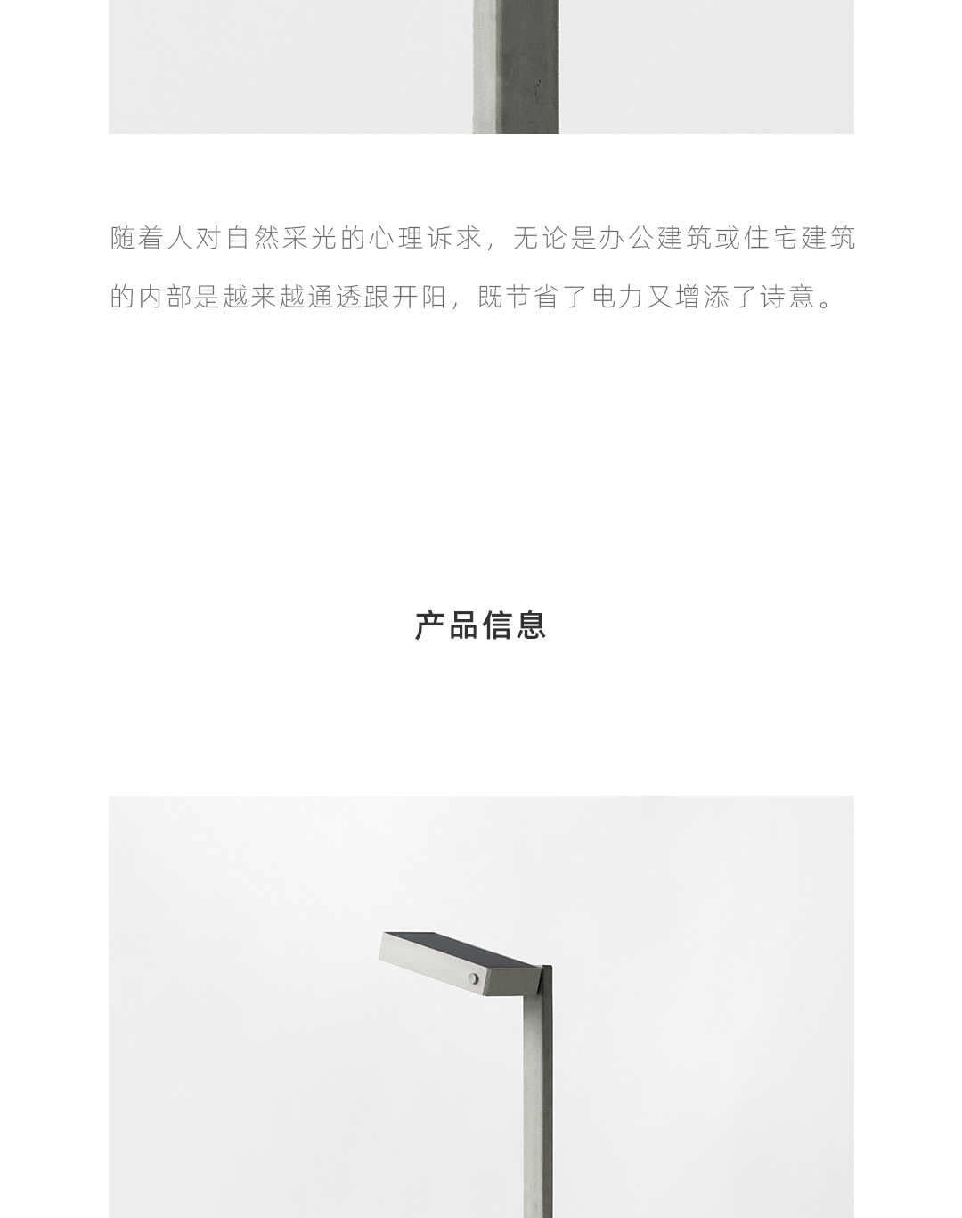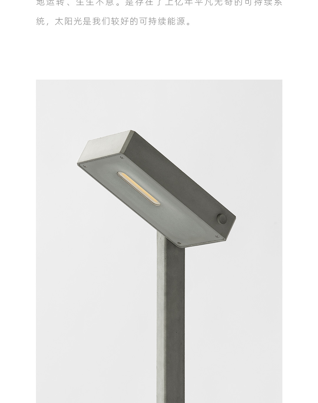 太阳光是最好的可持续能源。随着人对自然采光的心理诉求,无论是办公建筑或是住宅建筑的内部是越来越通透跟开阳,既节省了电力又增添了诗意。 一款无需插电,能在阳光充足的室内或者庭院区域使用的太阳能落地灯成为了可能。 太阳能技术在建筑供电领域上比较成熟,而涉及个体的家居产品并不常见,更多的太阳能家居产品诞生能唤起人们对可持续资源利用的意识,具有现实意义。