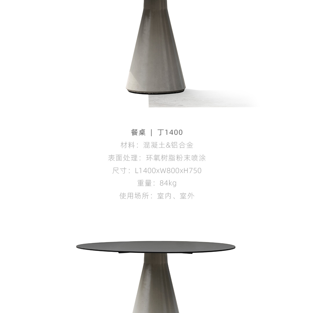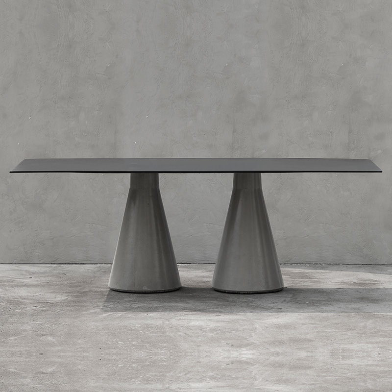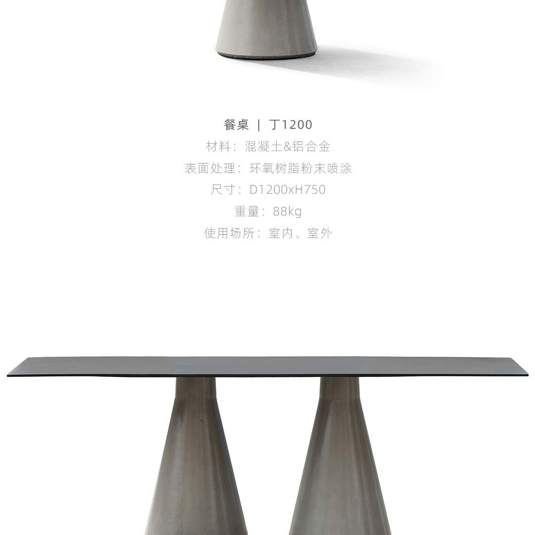 锥形几何建筑贯穿了人类整个文明,从原始的部落帐篷,到埃及、罗马石柱,至巨大的混凝土发电站建筑,是最稳定可靠的几何形态,是代表稳定的萃取形态, 利用建筑废渣与混凝土浇筑成底座,是桌子稳健的基石。 底部布满筋骨的全铝桌面,像巨大的太空飞船,厚重的金属怪物从天而降落,在人类文明石柱上筑起巢穴,对无味的空间发起挑战。