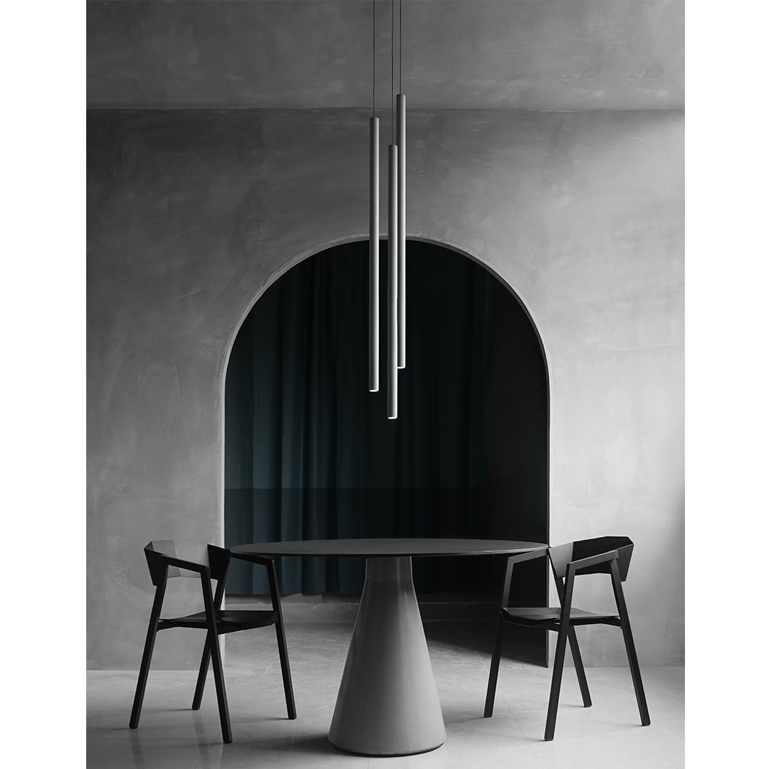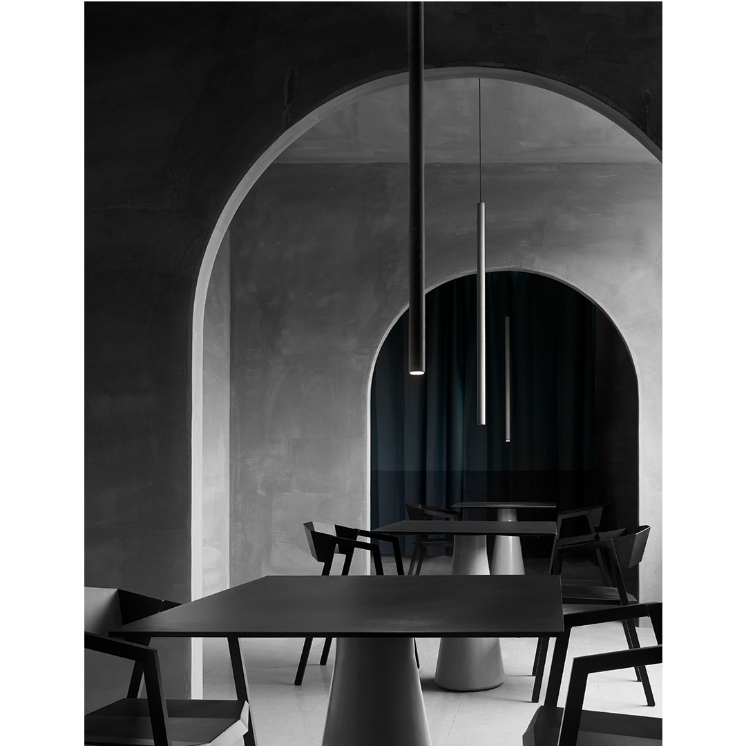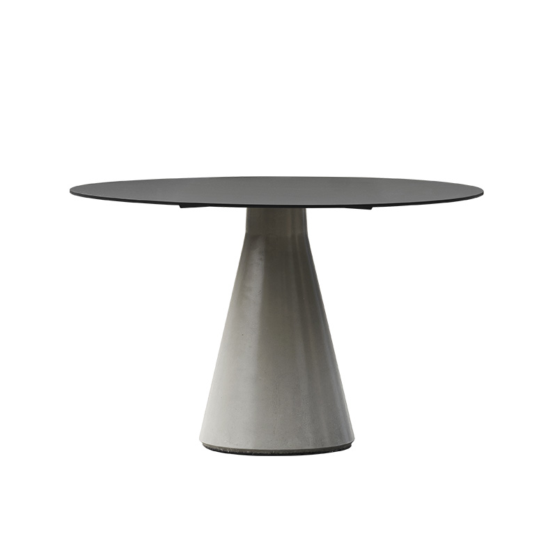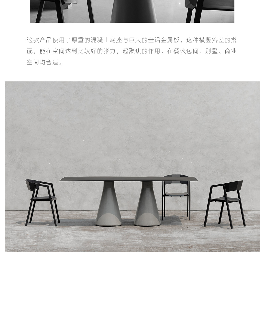 锥形几何建筑贯穿了人类整个文明,从原始的部落帐篷,到埃及、罗马石柱,至巨大的混凝土发电站建筑,是最稳定可靠的几何形态,是代表稳定的萃取形态, 利用建筑废渣与混凝土浇筑成底座,是桌子稳健的基石。 底部布满筋骨的全铝桌面,像巨大的太空飞船,厚重的金属怪物从天而降落,在人类文明石柱上筑起巢穴,对无味的空间发起挑战。