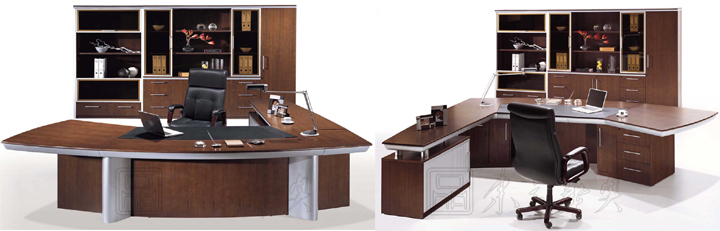 ※ 图为至尊班台不同角度展示图片,匹配于富品味的行政人员办公室,这木制行政人员工作间包括飞旋鏢型的桌面相连简单会议桌面,底部由哑面金属小圆柱承托,桌边的双色对比烘托出桌面、储物框架及地柜的相互协调;宽大的桌面配以书写垫内藏线缆储存空间及一边抛出形的会议桌,前面的曲尺间隔板令整体美观划一,小巧的侧桌底座则为卷门式的地柜,既提供储物用途又能节省空间,小型文件柜有三抽屉、但抽屉及掩门柜以收藏电脑主机。