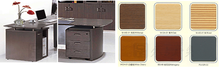 ※ 独特而时尚,木制行政人员书桌主要由一张两侧微弧形的桌面以两旁湾间隔板组成,前面四分之三高度的面板配以哑面银色,而附加的桌面由掩门式或开放式的小文件柜以放置电脑主机。多元化的储物配置包括活动文件柜、掩门地柜或地柜由中抽屉、上层架及两边掩门构成,另有归一设计的组合柜包括下部掩门、玻璃门及上部开放层架,同款弧形设计的会议桌可选择附加线缆储存系统。
