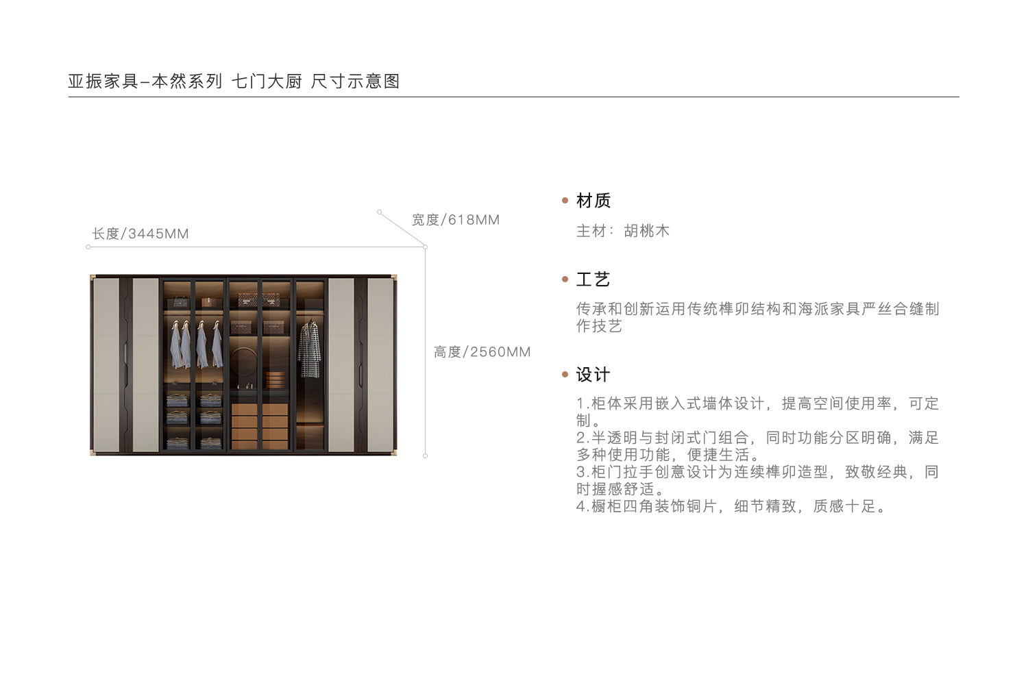 1.柜体采用嵌入式墙体设计,提高空间使用率,可定制。 2.半透明与封闭式门组合,同时功能分区明确,满足多种使用功能,便捷生活。 3.柜门拉手创意设计为连续榫卯造型,致敬经典,同时握感舒适。 4.橱柜四角装饰铜片,细节精致,质感十足。