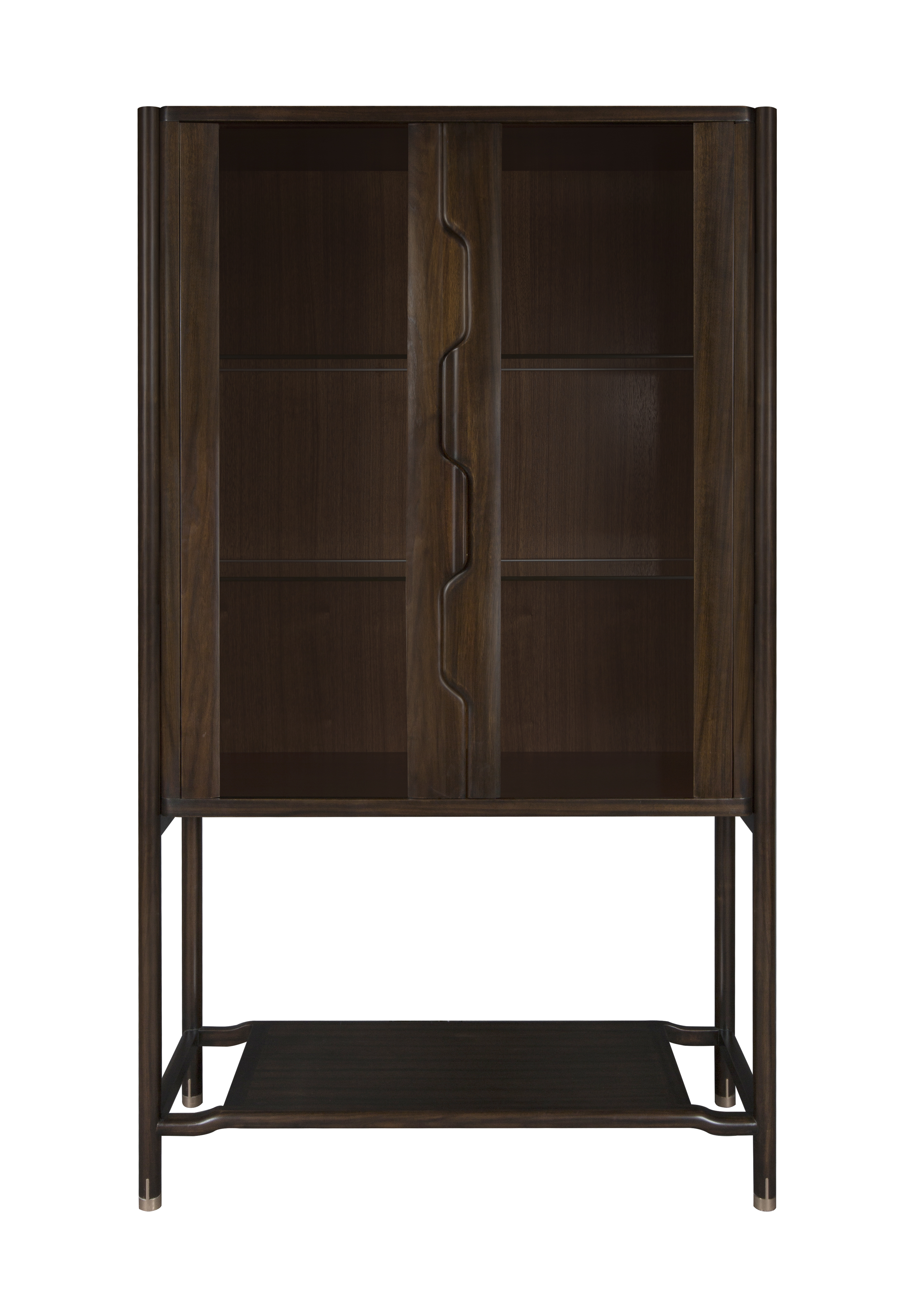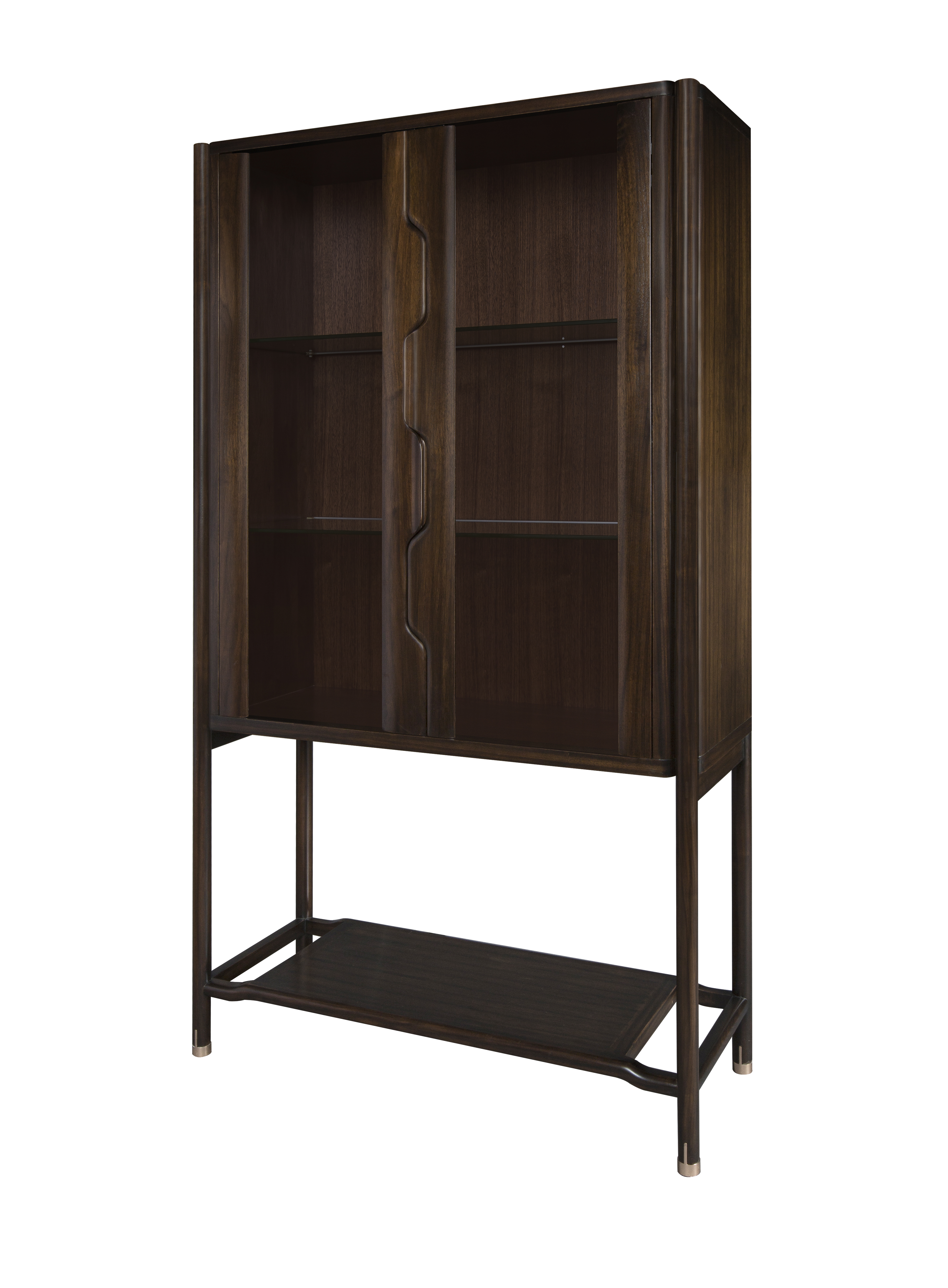 1.整体造型源于明式柜类家具形制,简洁干练,通透感强。 2.柜体内置LED灯,增强实用性。 3.柜门拉手创意设计为连续榫卯造型,致敬经典,同时握感舒适。 4.铜脚设计,赋予中式韵味的同时以防磨损。