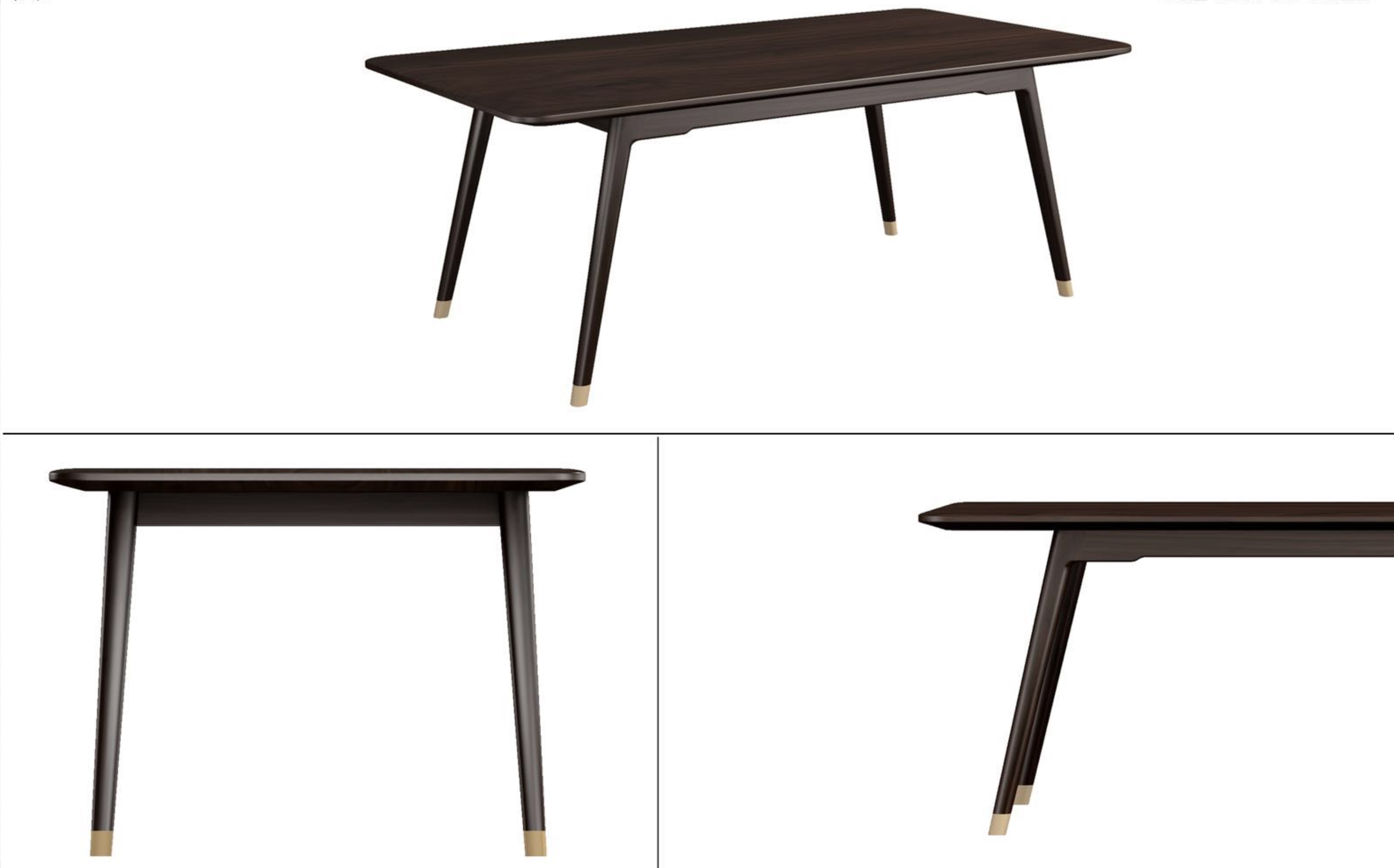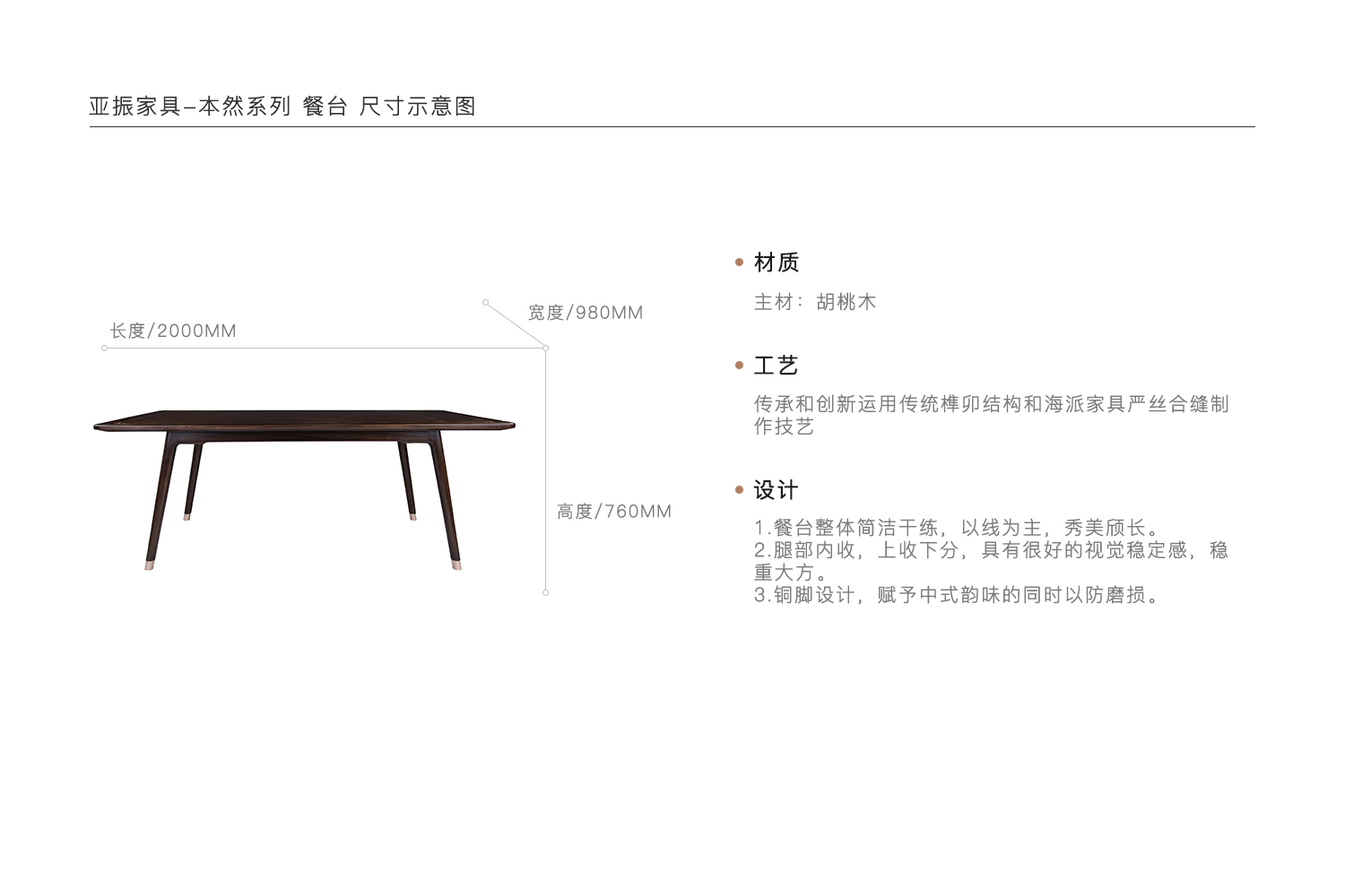 1.餐台整体简洁干练,以线为主,秀美颀长。 2.腿部内收,上收下分,具有很好的视觉稳定感,稳重大方。 3.铜脚设计,赋予中式韵味的同时以防磨损。