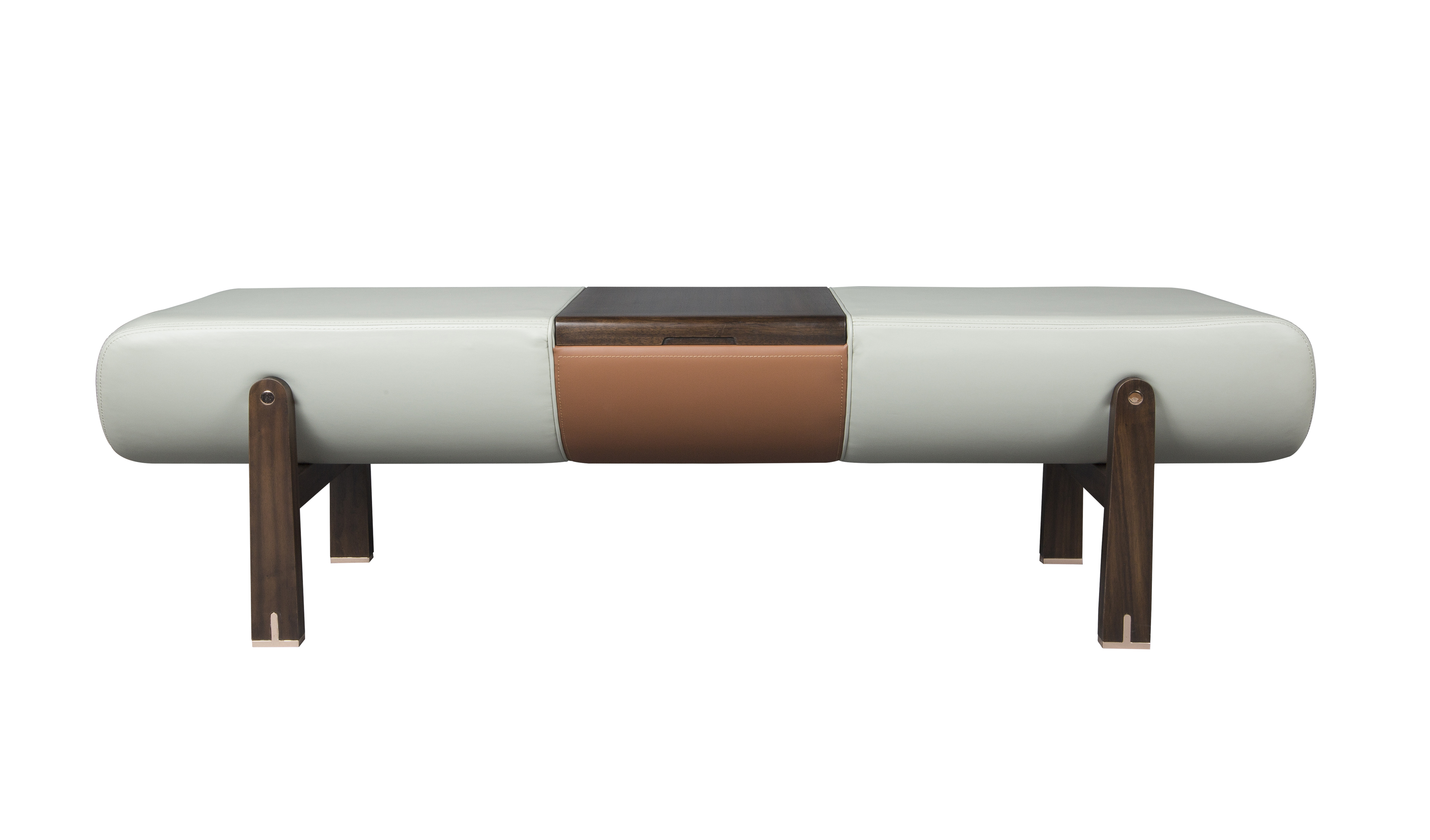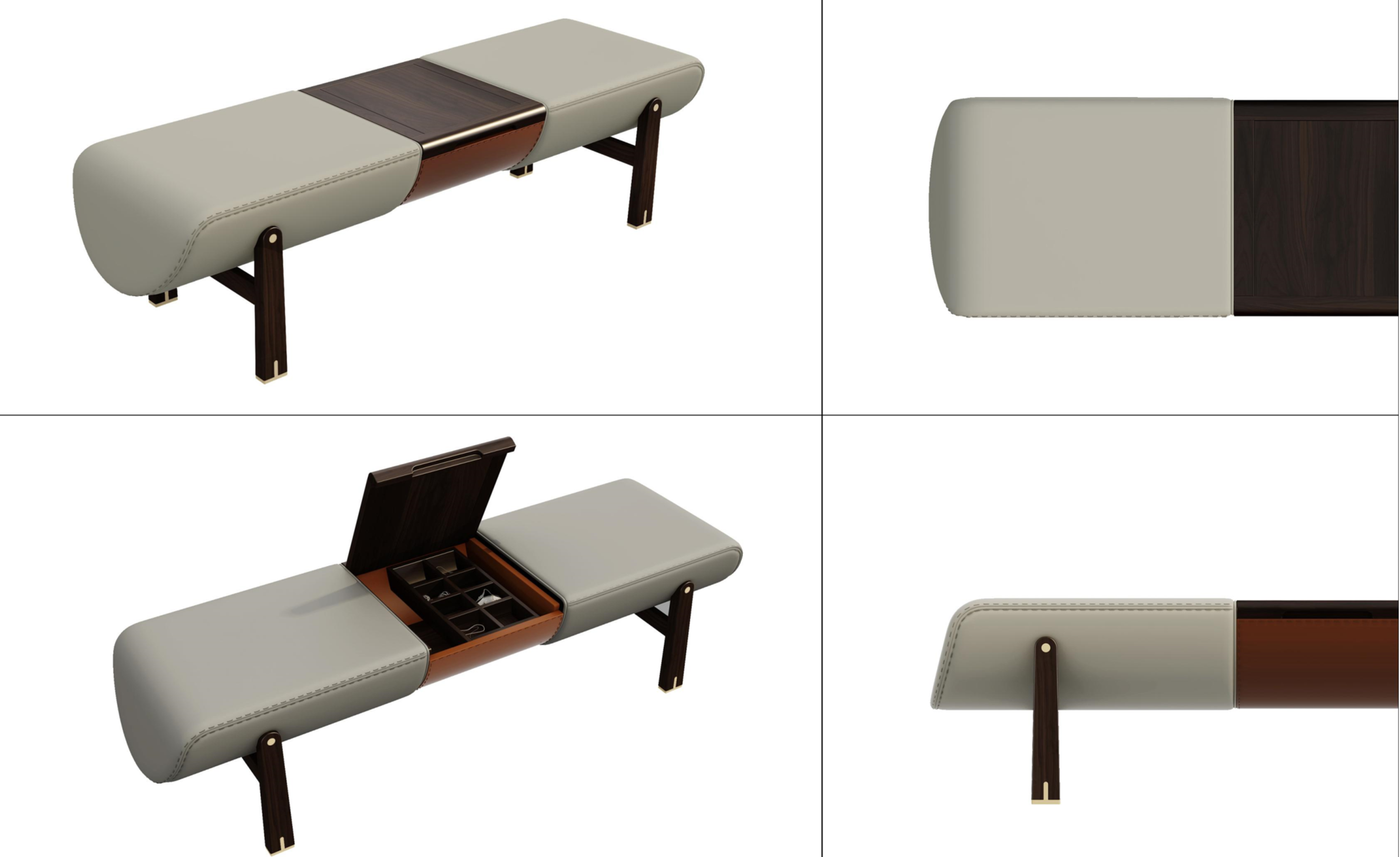 1.床前凳中间创意设计嵌入可储物空间,功能性强。 2.皮质坐垫软包舒适耐用,易于清洁。 3.铜脚设计,赋予中式韵味的同时以防磨损。