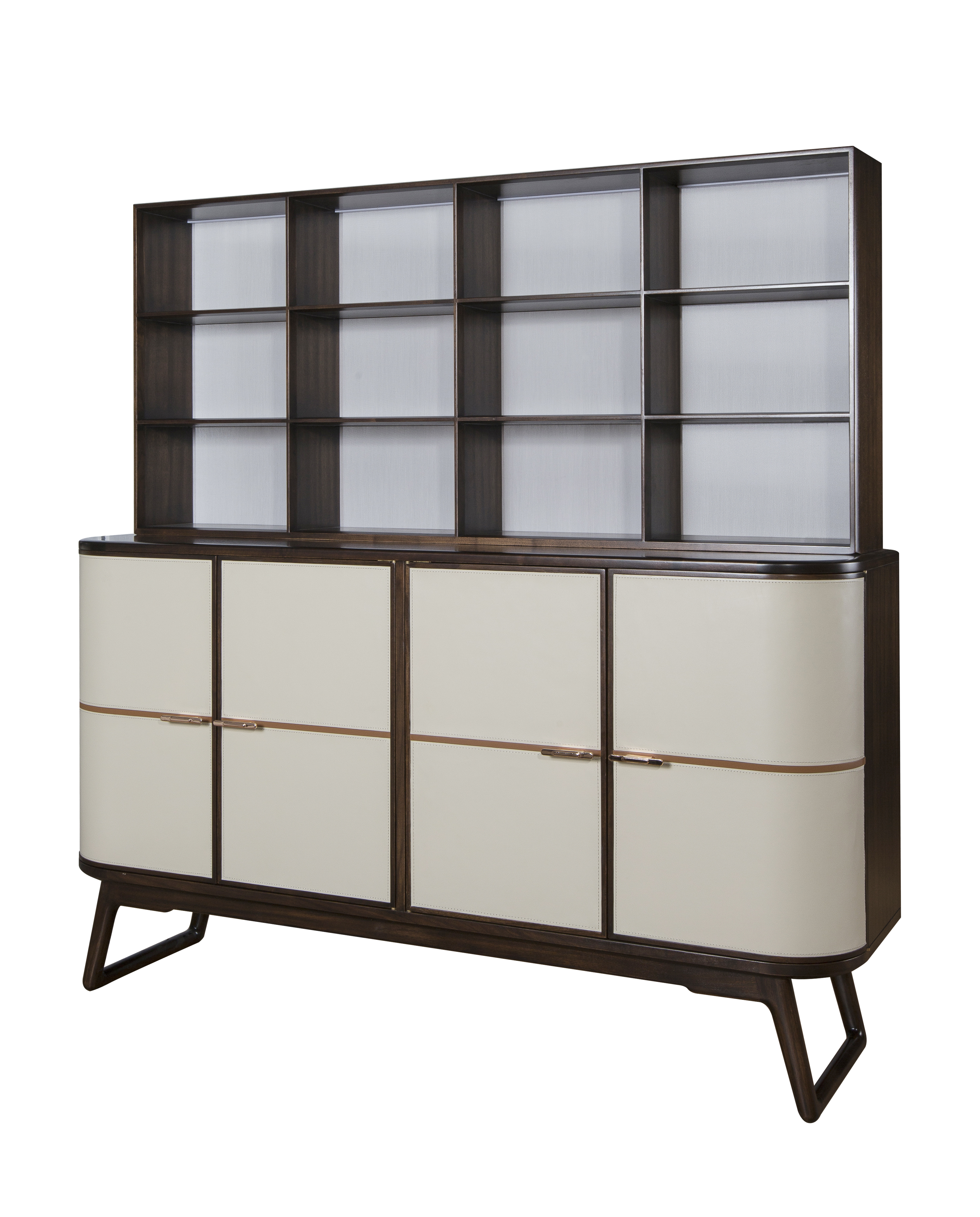 1.整体造型采用上方通透博物架与下方封闭柜体的组合设计形式,兼具展示与储藏功能。 2.柜体腿部内收,上收下分,具有很好的视觉稳定感,稳重大方。 3.简洁铜制拉手,在保证实用性的同时,赋予独特中式韵味,彰显价值。