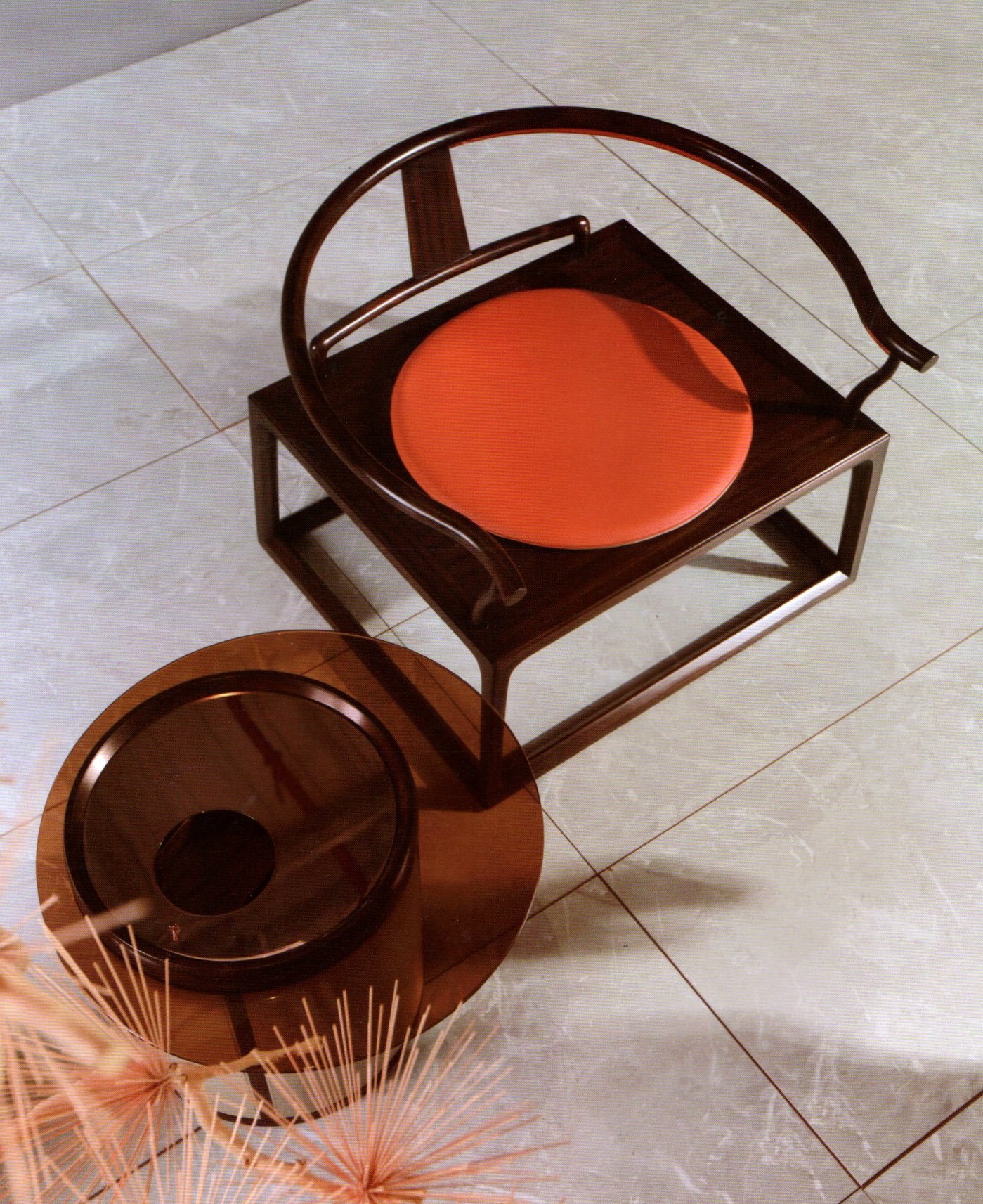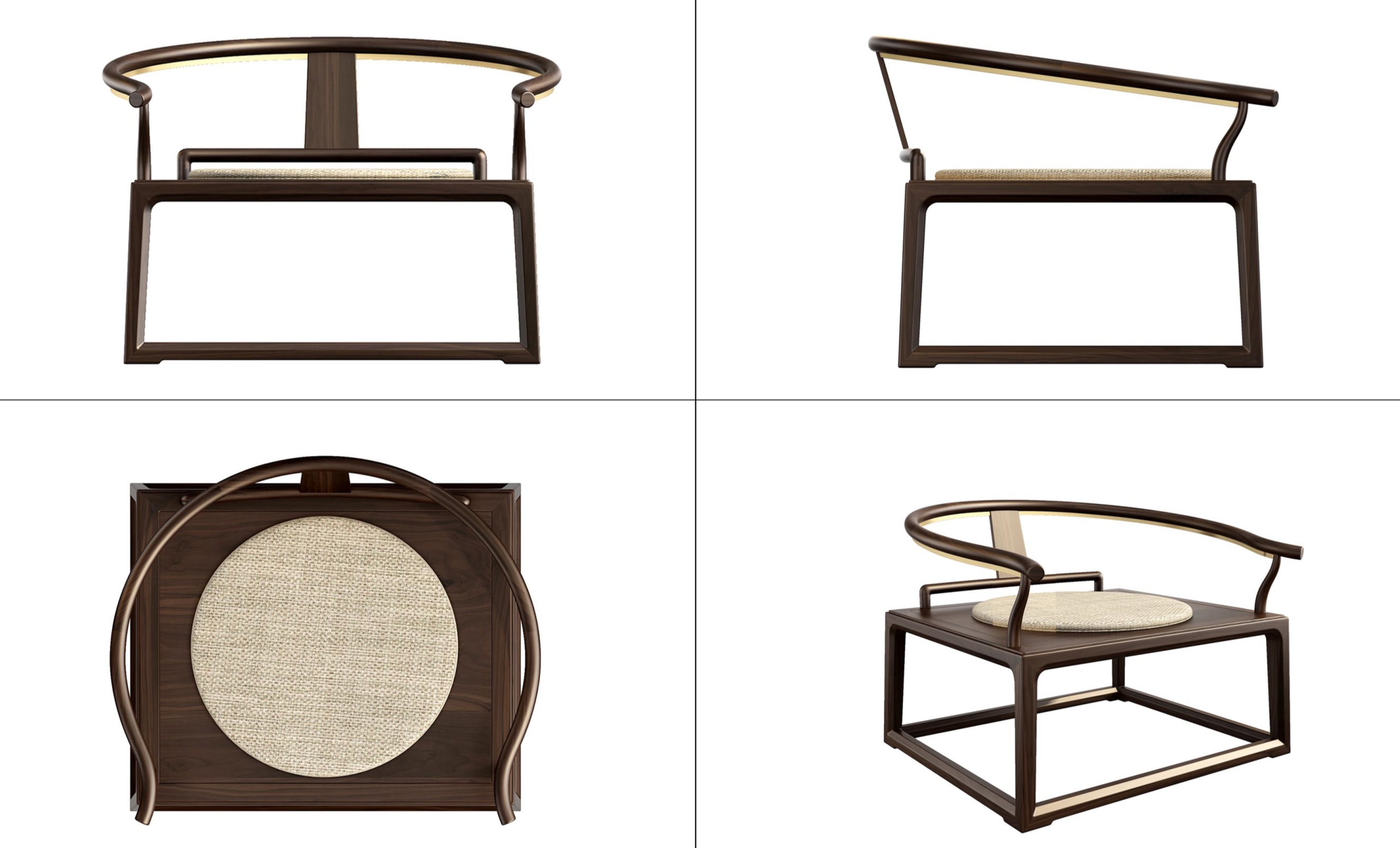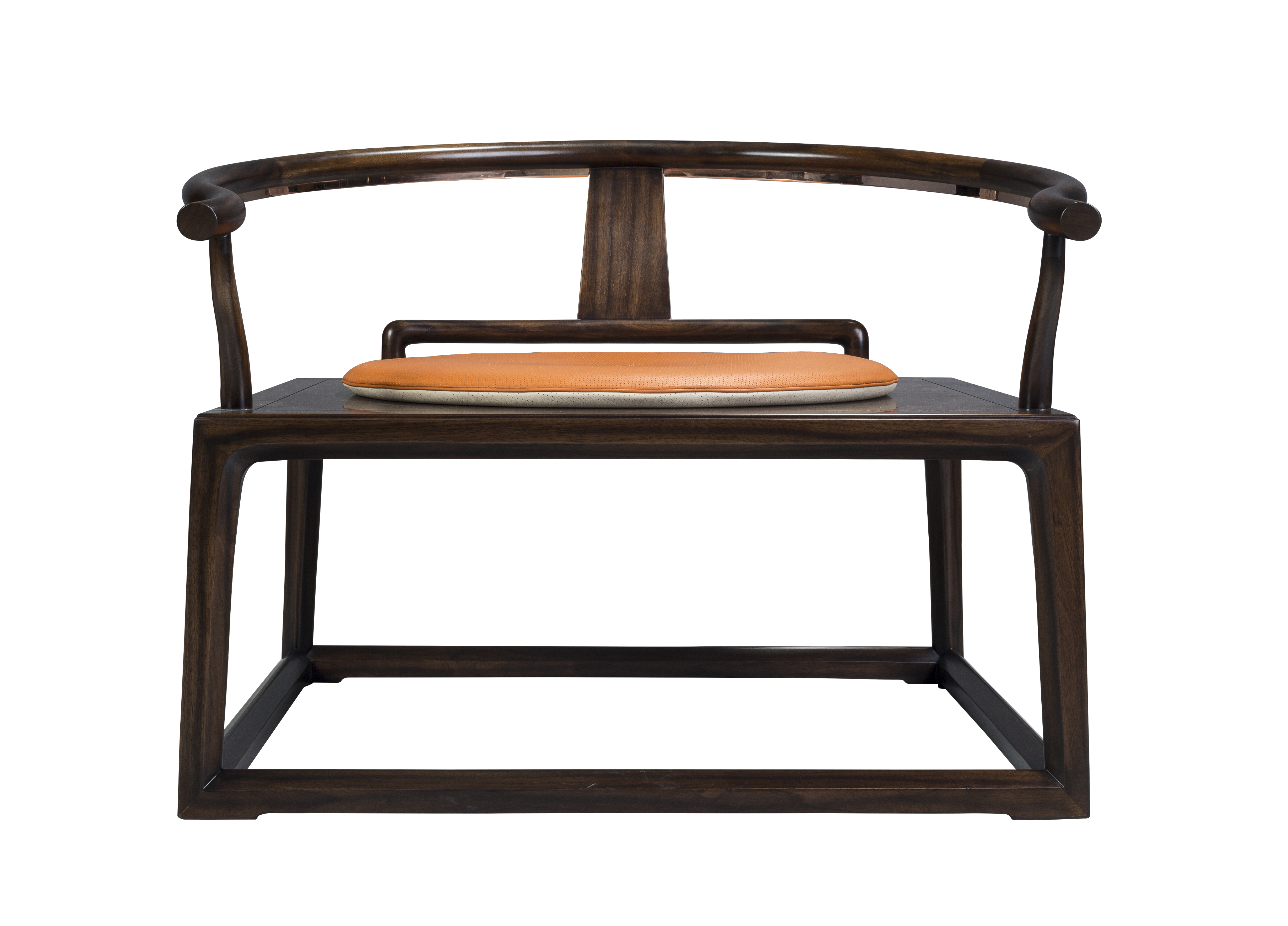 1.源于中式传统圈椅家具造型,以线为主,儒雅灵秀。 2.靠背板采用光素手法,精巧简洁,通透灵动。 3.坐面宽大,禅椅形制,可供盘腿而坐。 4.前侧脚踏装饰铜条,牢固耐磨,质感强。