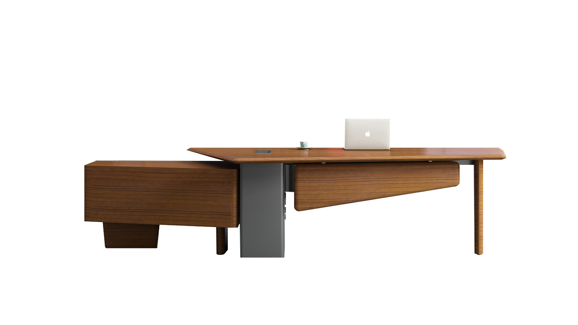 独特的台面造型,更好的兼顾了接洽的功能,是台面的功能 进一步延伸,给来访者提供更多的位置与空间。倾斜的侧柜 也让使用者有更大的活动空间,带来更广阔的视野。